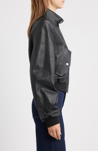 Soft ribbing anchors this timeless cropped bomber rendered in sleek leather. 20" length Front zip closure Mock neck Front button-flap pockets Ribbed cuffs and hem Unlined Leather Professional leather clean Made in Turkey