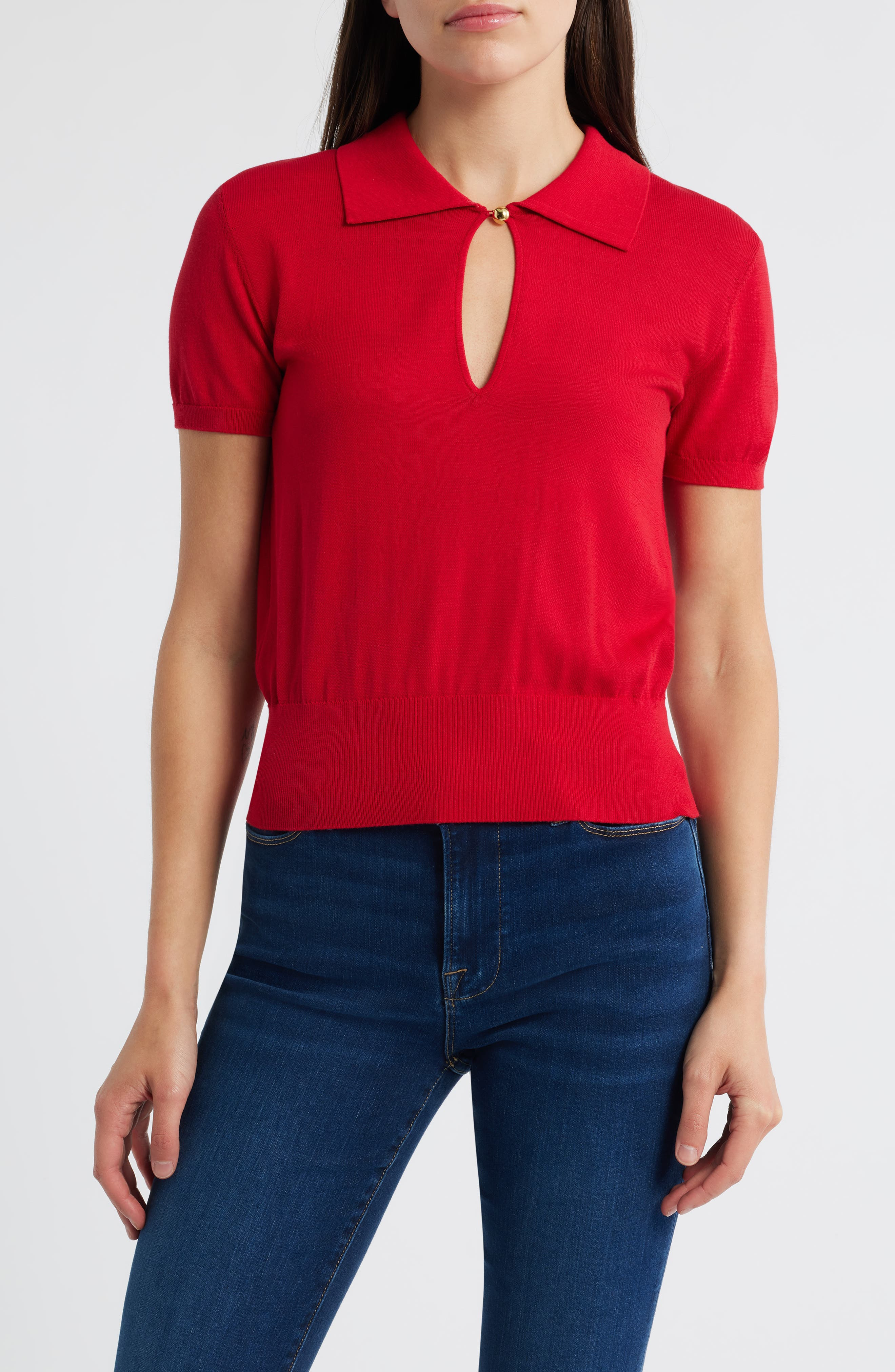A keyhole replaces the traditional button placket in this flirty rendition of the classic polo cut from a silky cotton blend that gives this style its soft, pleasing drape. Front keyhole with button-and-loop closure Spread collar Short sleeves 50% cotton, 50% modal Dry clean Imported