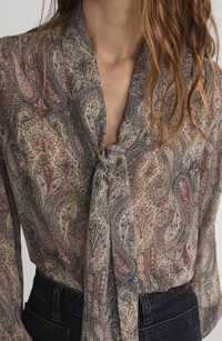 This fluid paisley silk shirt is beautifully detailed with sweeping ties that can be fashioned in a sweet bow or left undone for a laid-back look. Front button closure V-neck with ties Long sleeves 100% silk Dry clean Imported