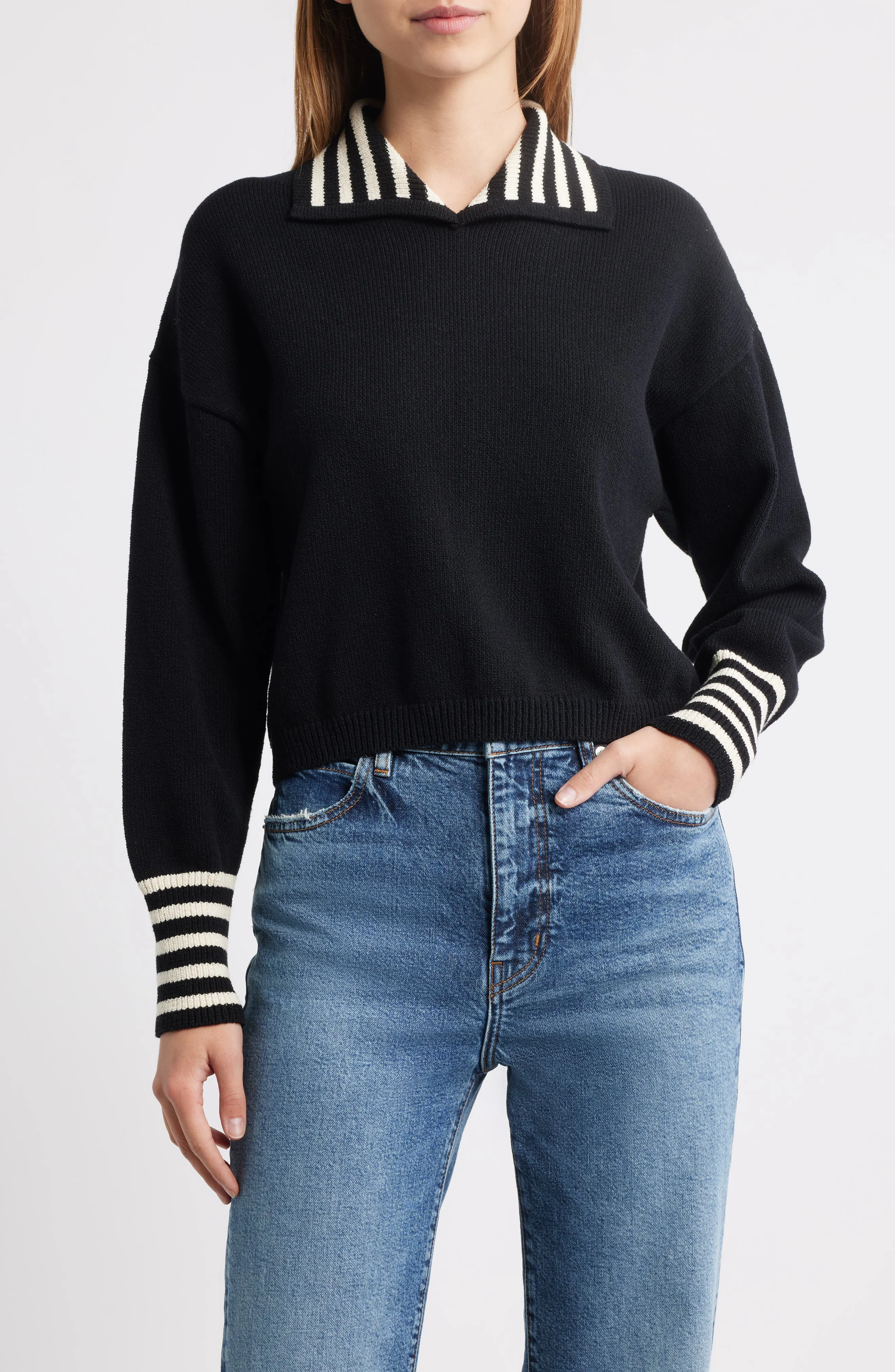This cotton-rich sweater features a zesty striped collar and cuffs to punctuate any look with a bit of nautical flair. 20" length Spread collar Long sleeves Ribbed cuffs and hem 75% cotton, 25% nylon Dry clean Imported