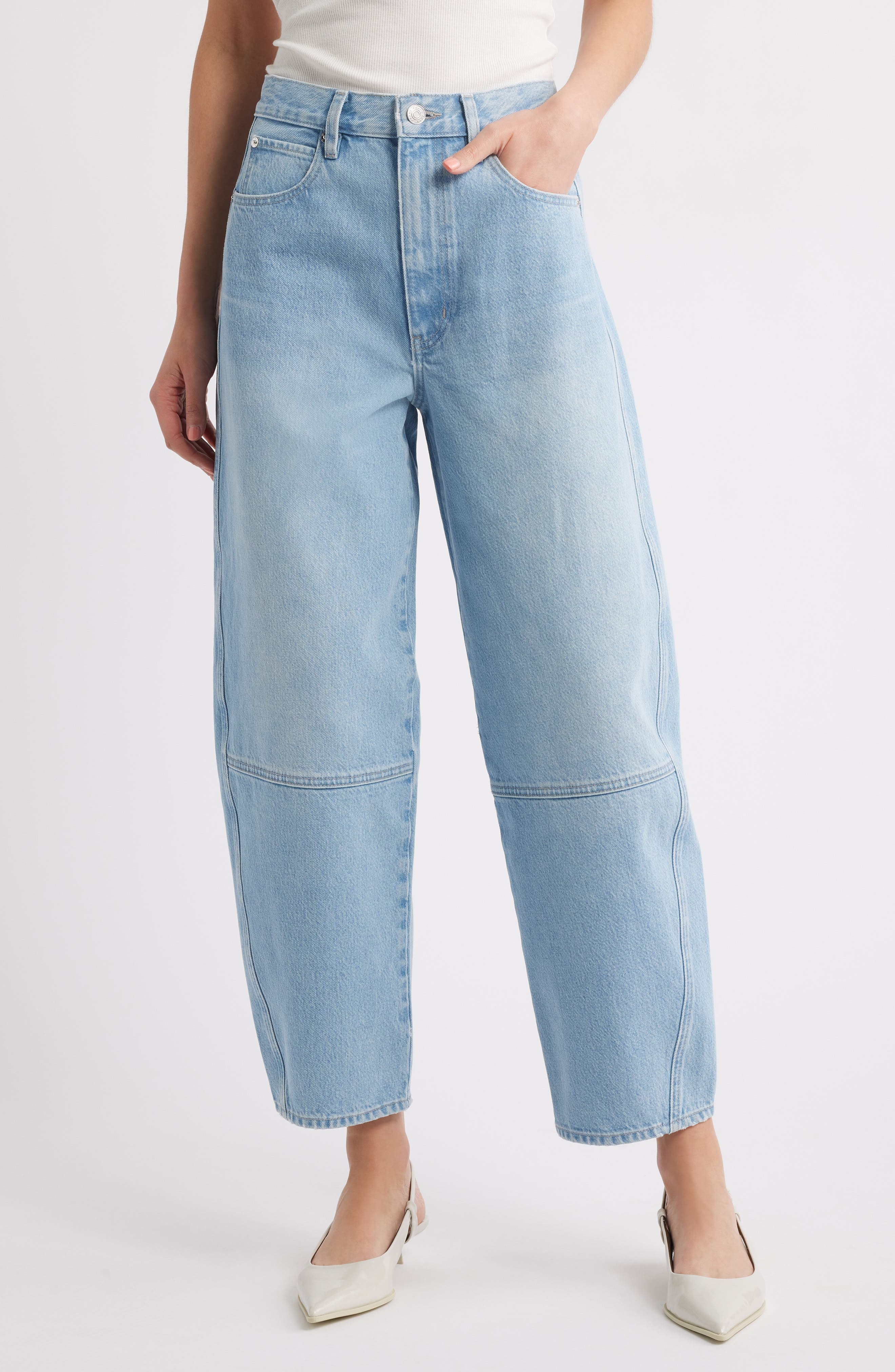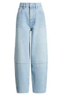 Vintage meets modern in these regenerative-cotton jeans flaunting paneled construction and relaxed barrel legs that curve out at the knees. 27 1/2" inseam; 15" leg opening; 12" front rise Zip fly with button closure Five-pocket style 100% regenerative cotton Machine wash, dry flat Made in Turkey