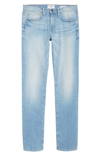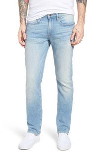 Lightweight stretch-denim jeans in a straight, tapered cut are faded and whiskered for a natural vintage feel. 33" inseam; 14" leg opening; 10" front rise; 14 1/2" back rise (size 32) Zip fly with button closure Five-pocket style 94% cotton, 5% polyester, 1% elastane Machine wash, tumble dry Imported