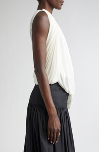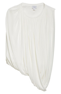 The label's delicate elegance pervades this creatively draped top that showcases a gently gathered neckline and a slanted bubble hem. A single long sleeve accentuates the artful asymmetry of this ivory-hued style. Scoop neck Single long sleeve 100% viscose Dry clean Made in Italy Designer Clothing