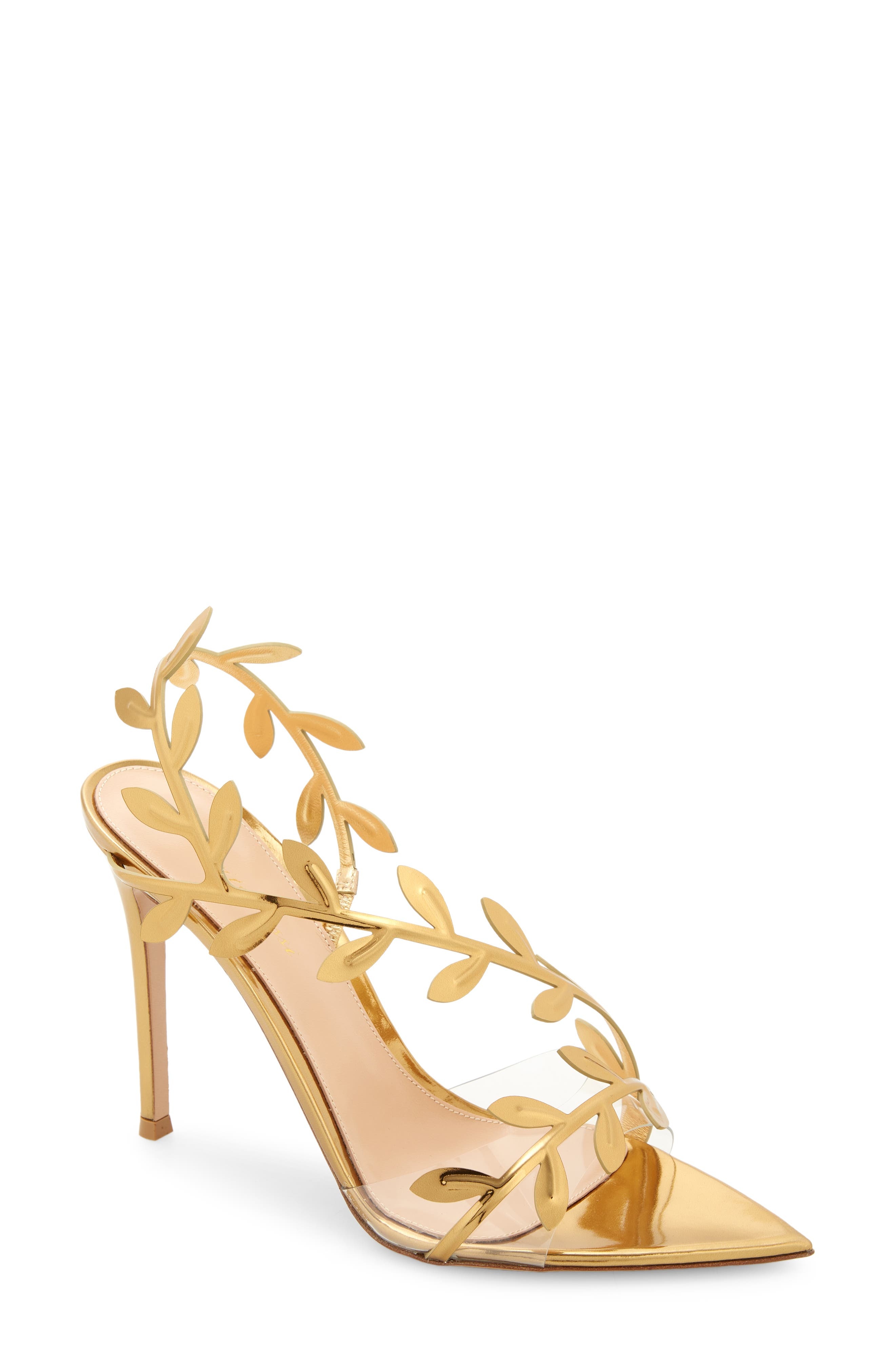 Bring Mount Olympus glamour to your look with this slingback sandal handcrafted with asymmetric straps of golden metallic leather that's laser cut into leaves. 4" (102mm) heel (size 38.5) Elasticized slingback strap Leather and synthetic upper and lining/leather sole Made in Italy Designer Shoes