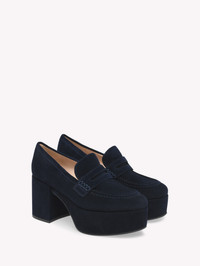 Crafted from suede, Jenna is a round toe moccasin with a 40mm platform and a 75mm chunky heel. The front presents a lightly padded penny bar. Handmade in Italy. Gianvito Rossi Jenna Mocassin Square Toe No closure 1,4 inches heel (35mm) Made in Italy Designer Shoes Item G25363.35RIC.SUEDENI