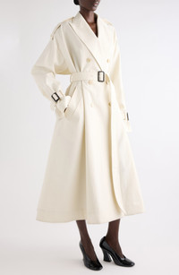 The polish of a classic trench meets the romance of a '50s-inspired A-line silhouette with this longline cotton-twill coat designed with bias-cut seams to create cocoon-like volume. Double-breasted button closure Peaked lapels Belted cuffs Front welt pockets Removable belt Storm flap Cotton lining 100% cotton Dry clean Made in Italy Designer Clothing