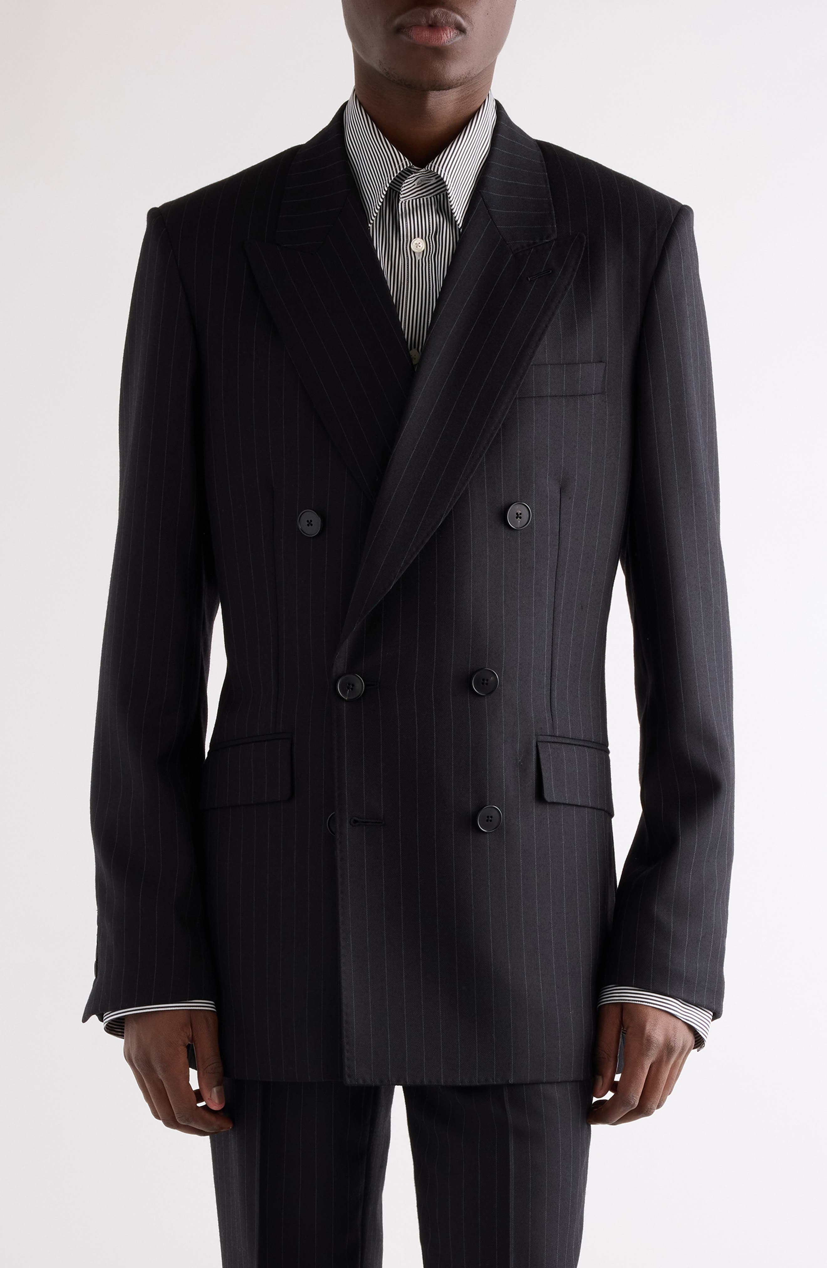 Patterned in chalky pinstripes, this suit jacket tailored from charcoal-grey wool features peaked lapels and double-breasted construction to give you a smart, old-school look. The fitted waist and flared cuffs bring a Carnaby Street finish to the elegant profile.Fabrication: Worsted wool is a fine-grade fabric made from long wool fibers that are combed and carded to be smooth, durable and flexible enough to help formalwear maintain its shape. Naturally breathable and water-resistant, worsted wool retains warmth in the cold and provides ventilation in the heat.Formality: Formal occasions including business meetings, weddings, funerals and other settings that require you to look elegant without being too casual Double-breasted button closure Peaked lapels Nonfunctional four-button cuffs Chest welt pocket; front flap pockets Side vents Lined 100% wool Dry clean Made in Italy Designer Clothing
