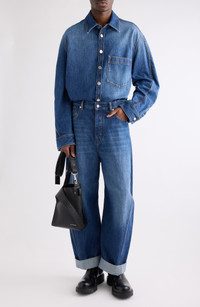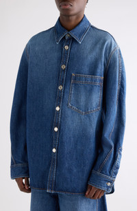 An elevated take on utility, this denim overshirt flows with relaxed proportions and soft, dropped shoulders, while logo-embossed hardware and a suede patch at the nape infuse a sense of luxe modernity. Front button closure Point collar Curved hem Long sleeves with button cuffs Chest patch pocket 100% cotton with leather detail Machine wash, line dry Made in Italy Designer Clothing