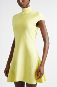 Stand out with the vibrant hue of this knit minidress done in a minimalist silhouette that ends in a flouncy godet-flared skirt. Hidden side-zip closure Mock neck Cap sleeves 45% viscose, 35% wool, 14% polyamide, 5% polyester, 1% elastane Dry clean Made in Italy Designer Clothing