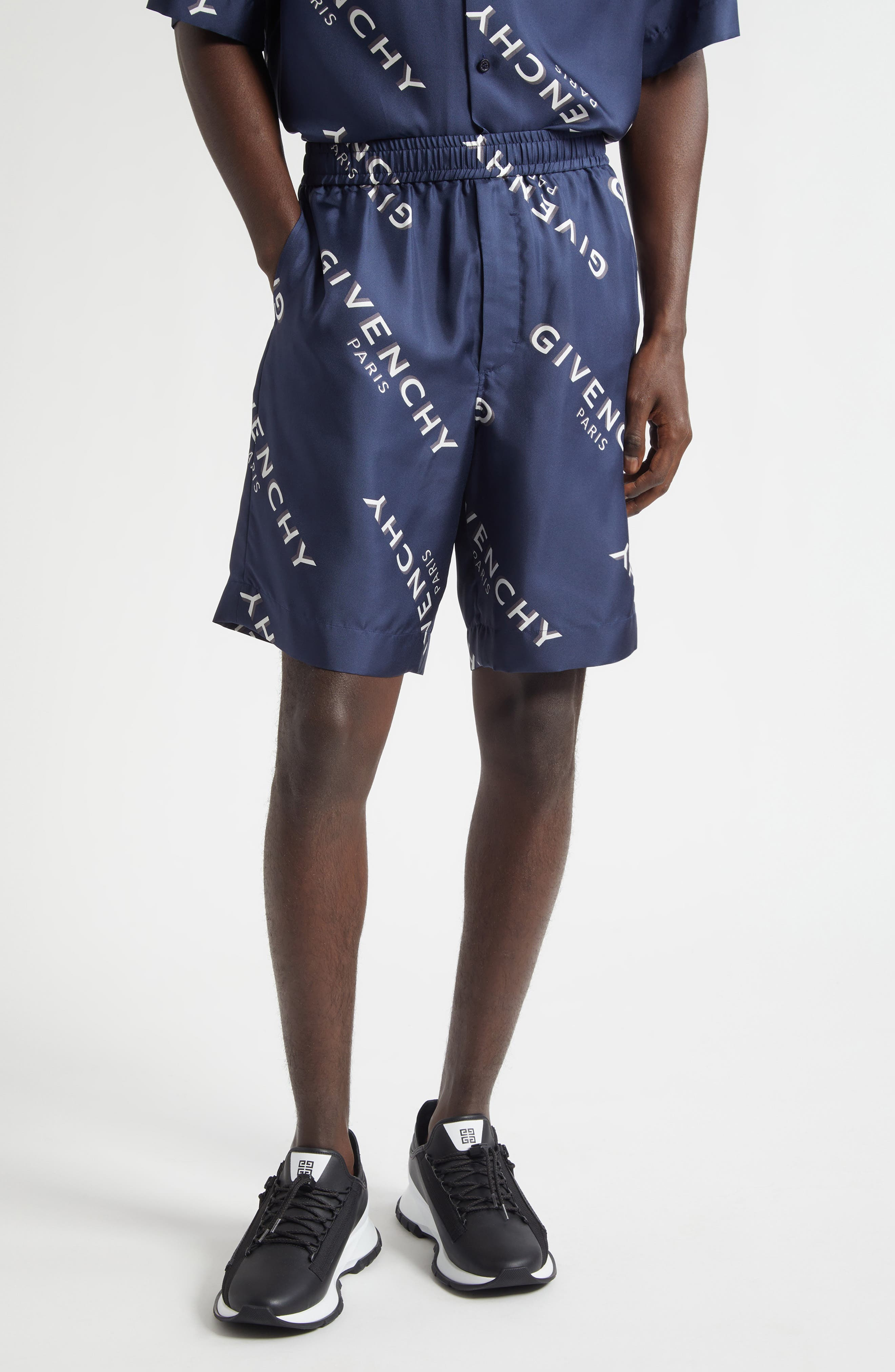 Givenchy Logo Print Elastic Waist Silk Shorts in Navy at Nordstrom