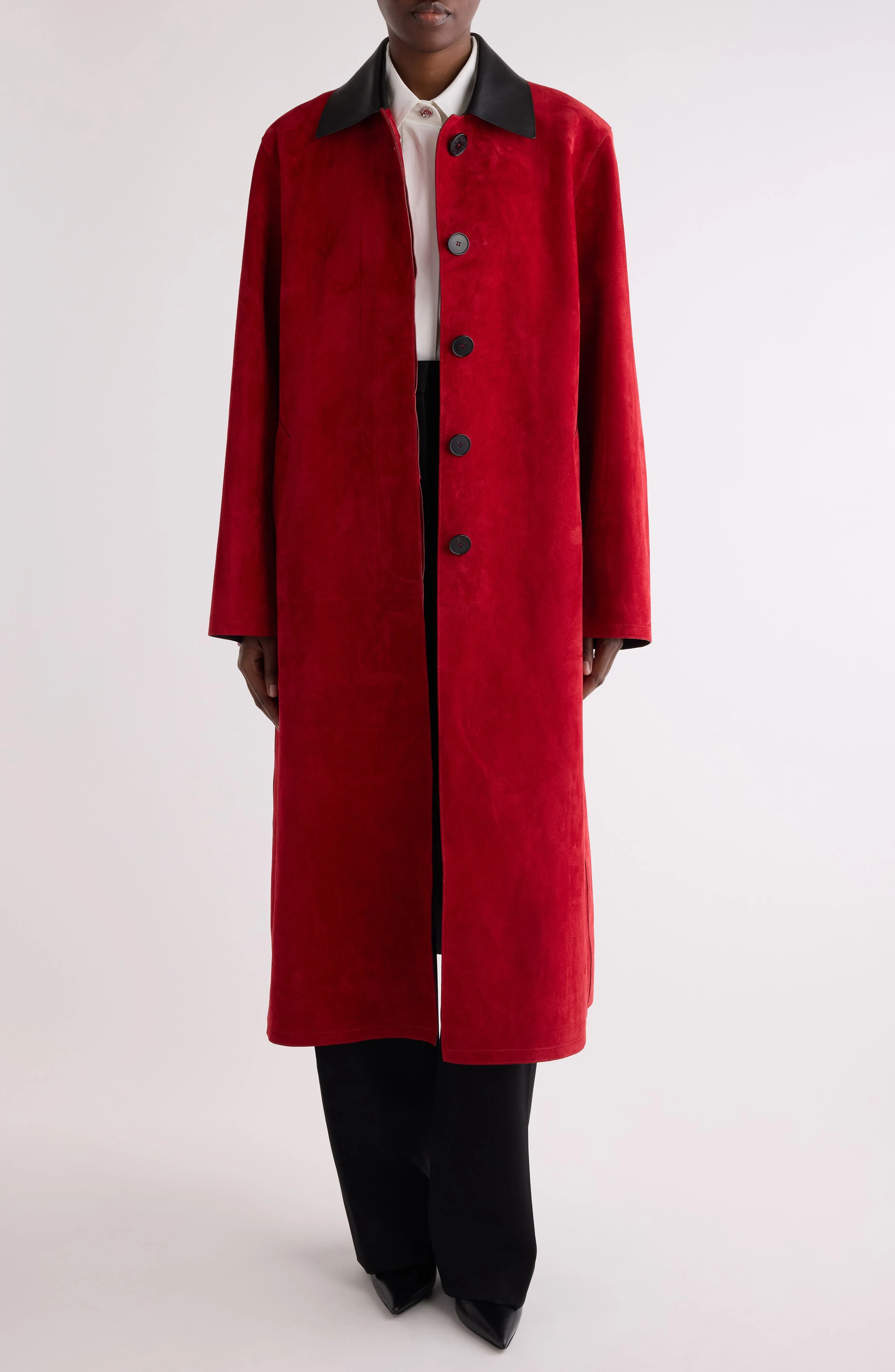 Rich red suede makes this long coat a stunner—contrasting with the dark buttons and black lambskin-leather collar to make it a smart topper for any look. Hidden-button placket Spread collar Front welt pockets Back vent Leather Professional leather clean Dry clean Designer Clothing