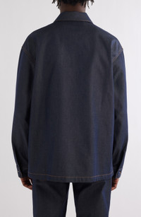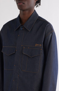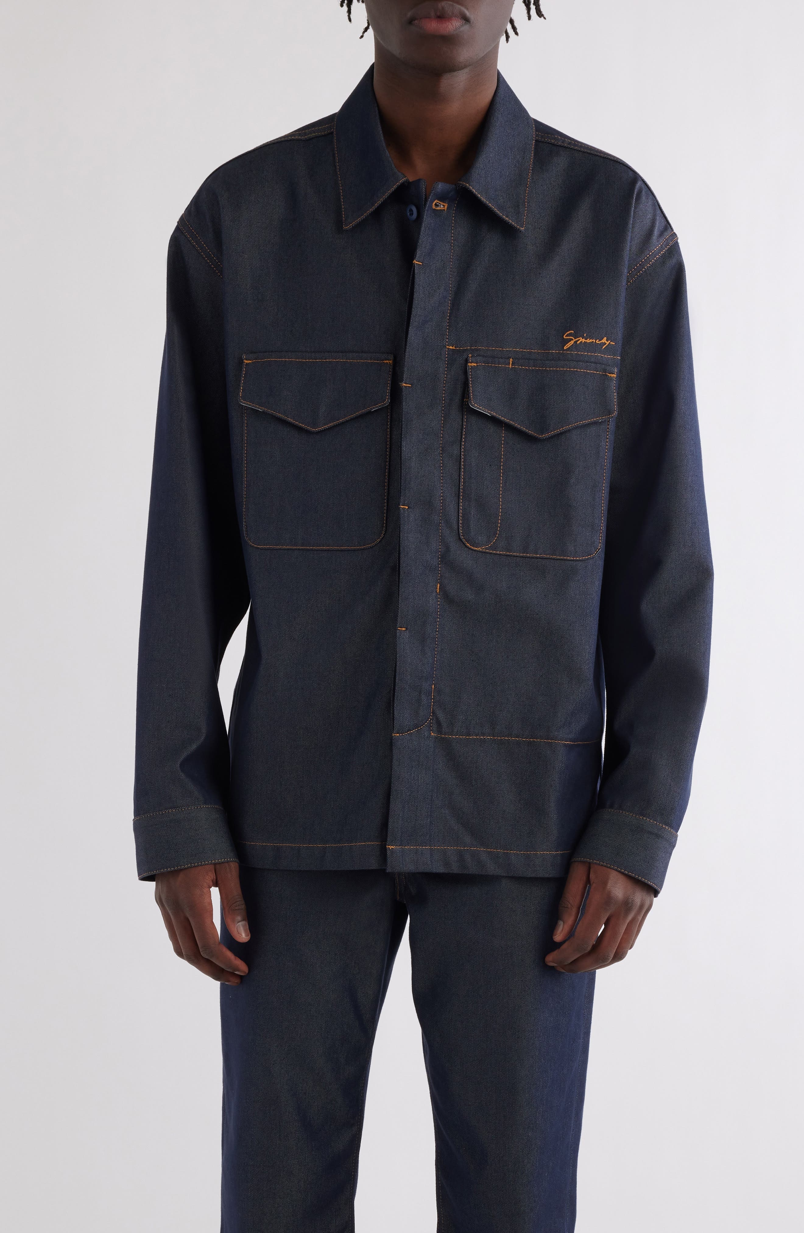 Silk-softened denim brings laid-back luxury to a logo-embroidered overshirt that's traced with tobacco topstitching and finished with a hidden placket. Hidden-button placket Point collar Long sleeves with button cuffs Chest flap-patch pockets 66% cotton, 34% silk Dry clean Made in Italy Designer Clothing