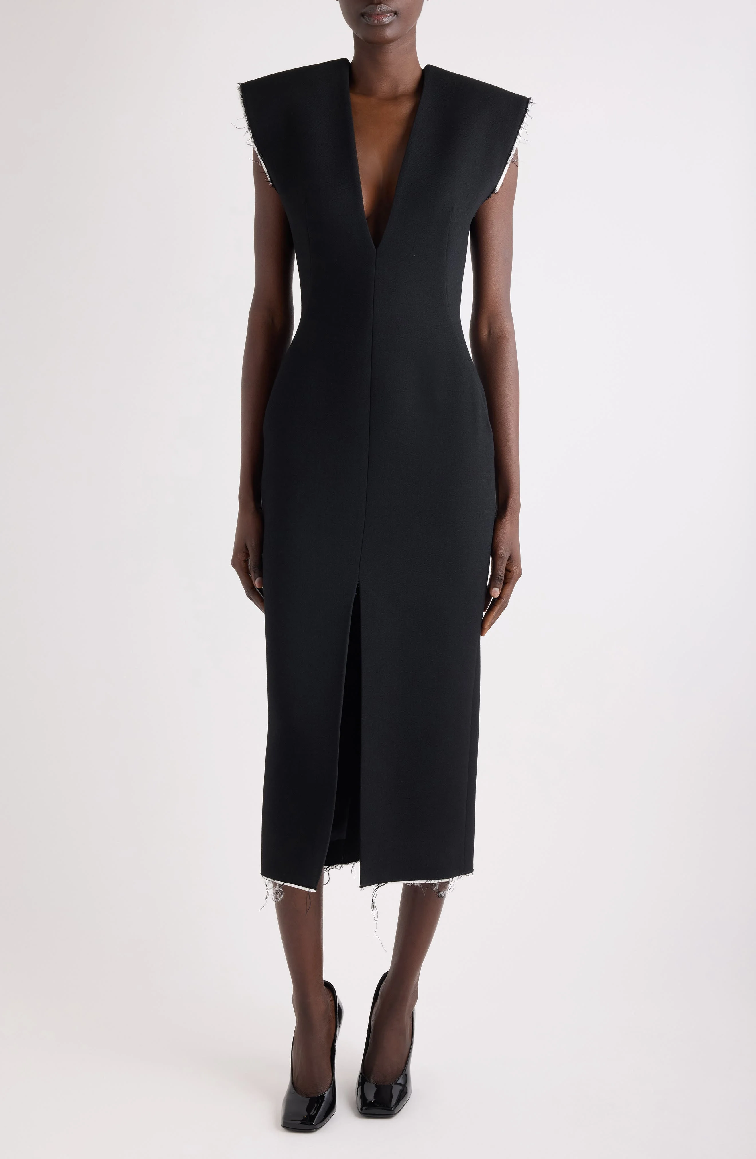 Raw edges with exposed stabilizer lends an air of deconstruction to this sheath dress structured from wool-forward crepe with a hint of stretch. Hidden back-zip closure Plunge V-neck Sleeveless, with padded shoulders Front slit Back slit Lined 90% wool, 7% polyamide, 3% spandex Dry clean Made in Italy Designer Clothing