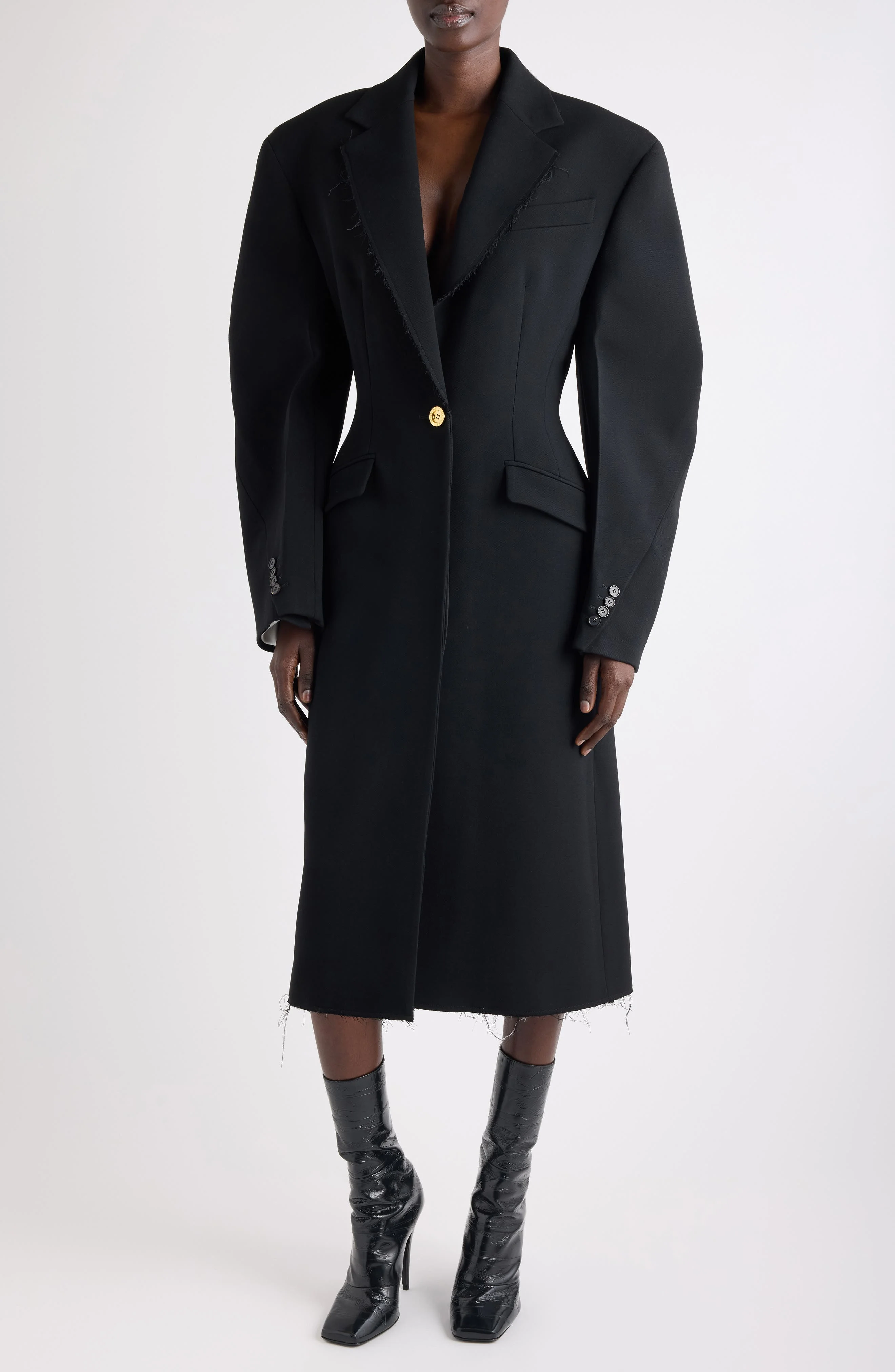 A standout from the label’s fall '25 collection, this wool-blend coat reinterprets classic tailoring with an avant-garde edge. Structured shoulders transition into subtly twisted sleeve seams to sculpt a voluminous cocoon silhouette. Frayed edges lend the brand’s signature grungy attitude, while a single logo-embossed button—gleaming like jewelry—anchors the design in unmistakable meticulous craftsmanship. One-button closure Notched lapels Four-button cuffs Chest welt pocket; front flap pockets Back vent Lined 90% wool, 7% polyamide, 3% elastane Dry clean Made in Italy Designer Clothing