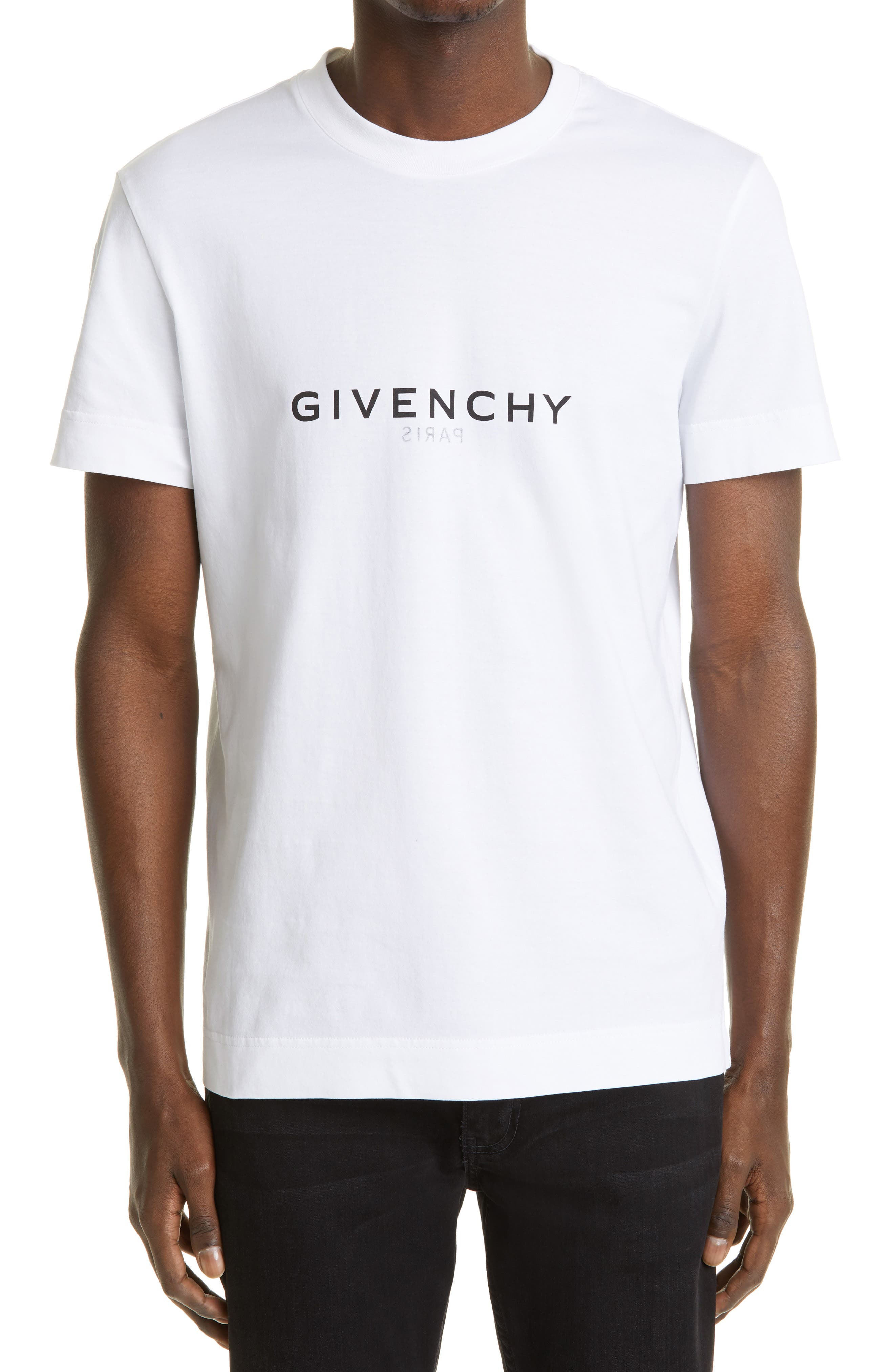 'Givenchy' and 'Paris' trade off appearing in mirrored print at the front and back of this slim-fit T-shirt, giving an unexpected twist to the house logo. 28 1/2" length (Size Medium) Crewneck Short sleeves 100% cotton Machine wash, dry flat Made in Portugal Men's Designer Clothing