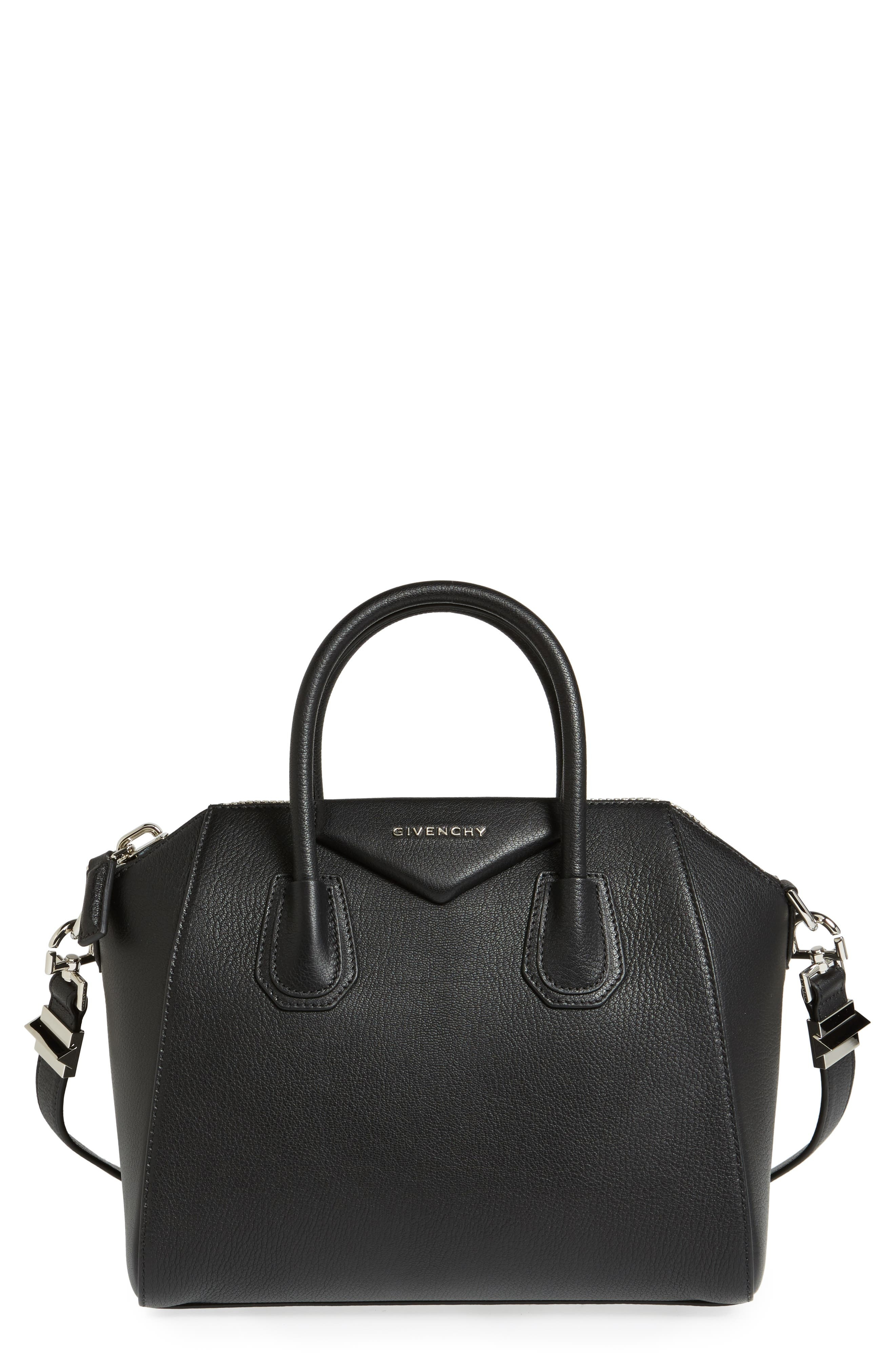 Beloved by street-style mavens the world over, Givenchy's Antigona satchel is updated in richly dyed leather, imparting subtle texture to the structured style. A chic, compact size, rolled top handles and an optional shoulder strap add versatility to the fashionable bag. Top zip closure Top carry handles; removable shoulder strap Interior wall, zip and smartphone pockets Protective feet Leather Made in Italy Designer Handbags