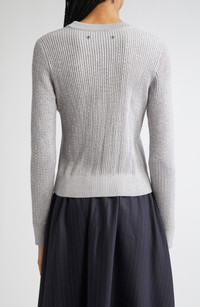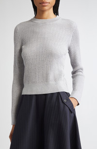 A quiet shimmer runs through this virgin wool sweater that catches light with every move. The rib-knit design feels like a second skin, and the twinning stars at the nape make it unmistakably the label’s own. Crewneck Long sleeves Ribbed cuffs and hem 100% virgin wool Hand wash, dry flat Made in Italy Designer Clothing