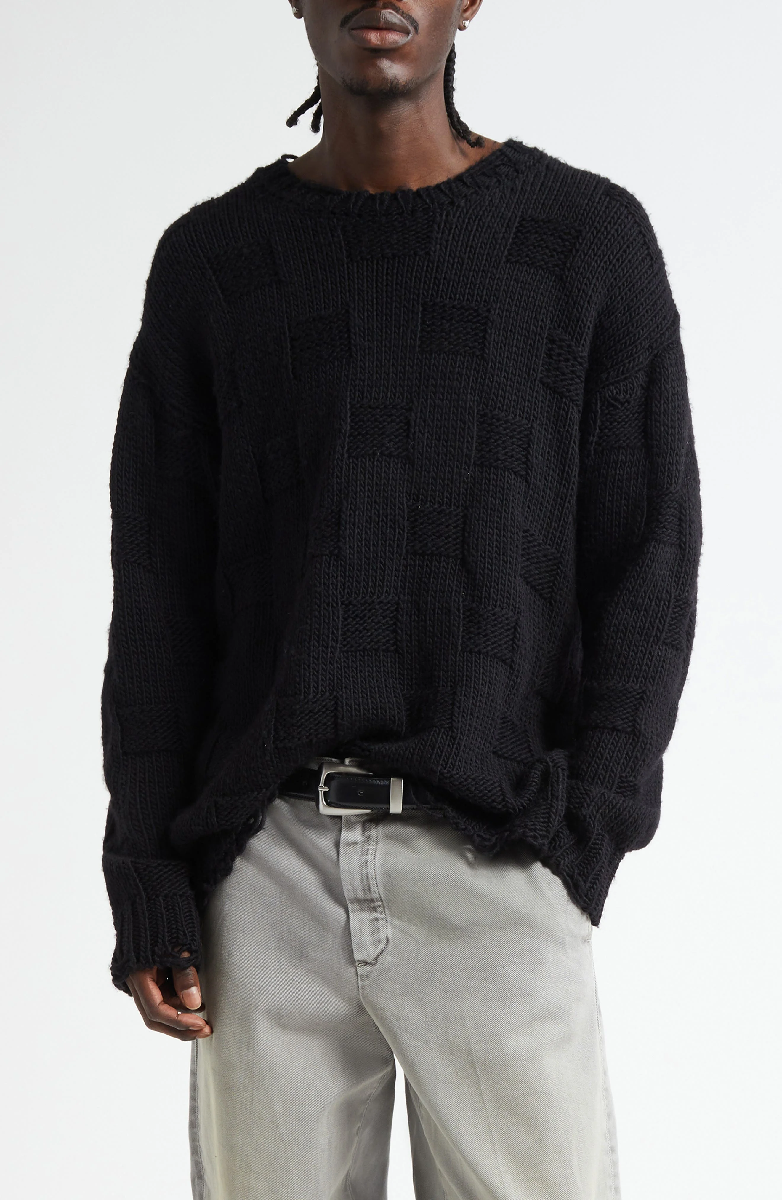 Signature distressing tatters an oversized sweater knit in Italy from pure wool in a subtle checkerboard pattern. Crewneck Long sleeves Dropped shoulders 100% wool Dry clean Made in Italy Designer Clothing