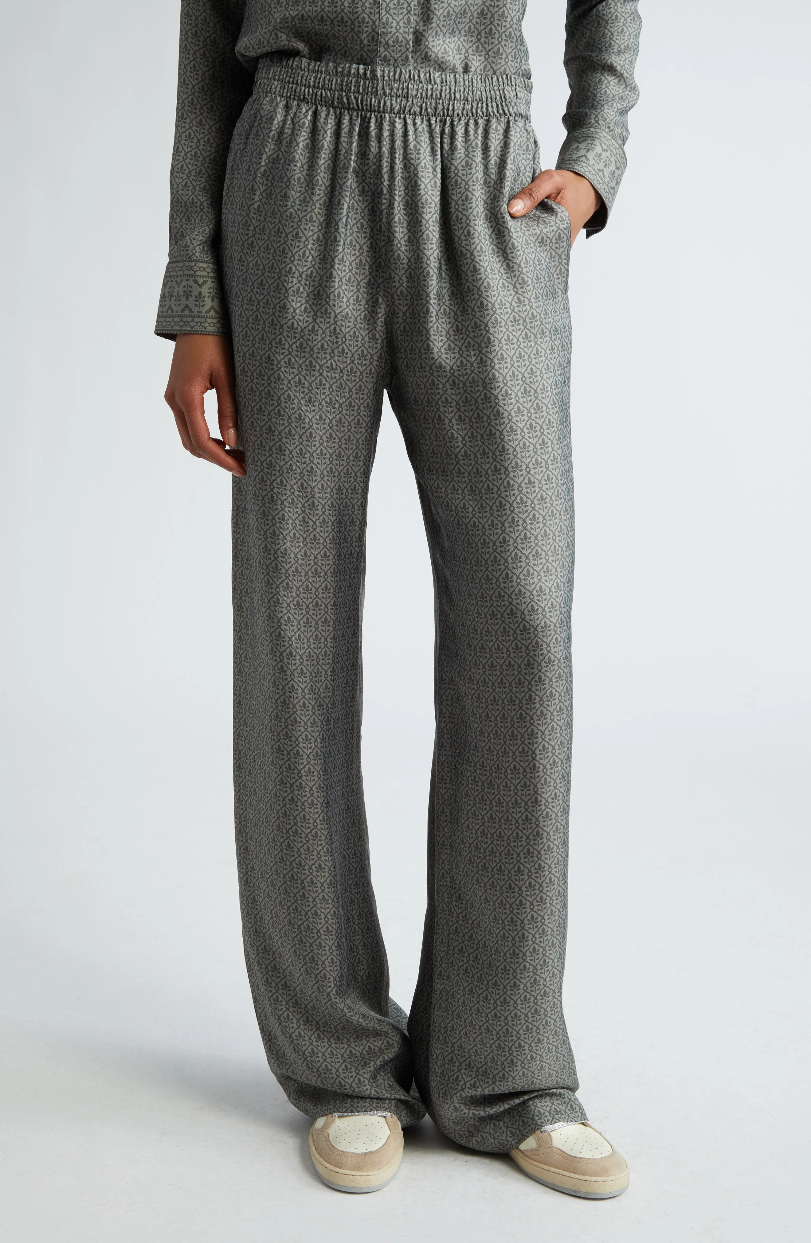 A tile-inspired floral print patterns these silk-enriched twill pants crafted in a relaxed, easygoing fit with an elastic waist and flowy wide legs. Elastic waist Side-seam welt pockets 70% viscose, 30% silk Hand wash, line dry Made in Italy Designer Clothing