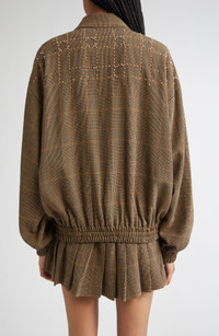 Glen plaid lends sartorial polish while crystal embellishments add glam appeal to this bomber jacket cut in a roomy fit from Italian virgin wool. Two-way front-zip closure Spread collar Elastic cuffs Front welt pockets Lined 100% wool Dry clean Made in Italy Designer Clothing
