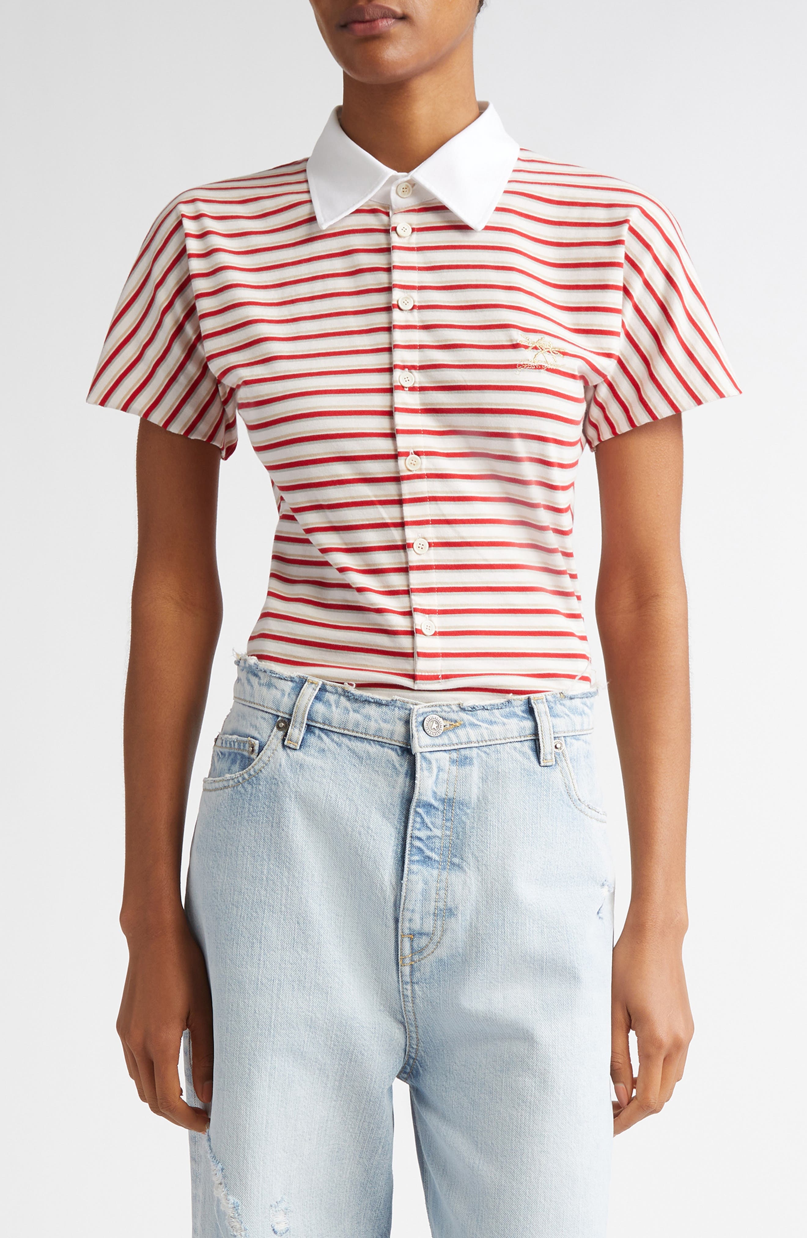 A palm-tree logo embroidered in golden threads heightens the sun-seeking vibes of this contrast-collar polo cut for a slim silhouette from soft cotton patterned in retro stripes. An elongated half placket and short dolman sleeves add to the relaxed vibe. Button half placket Spread collar Short sleeves 100% cotton Machine wash, dry flat Made in Italy Designer Clothing