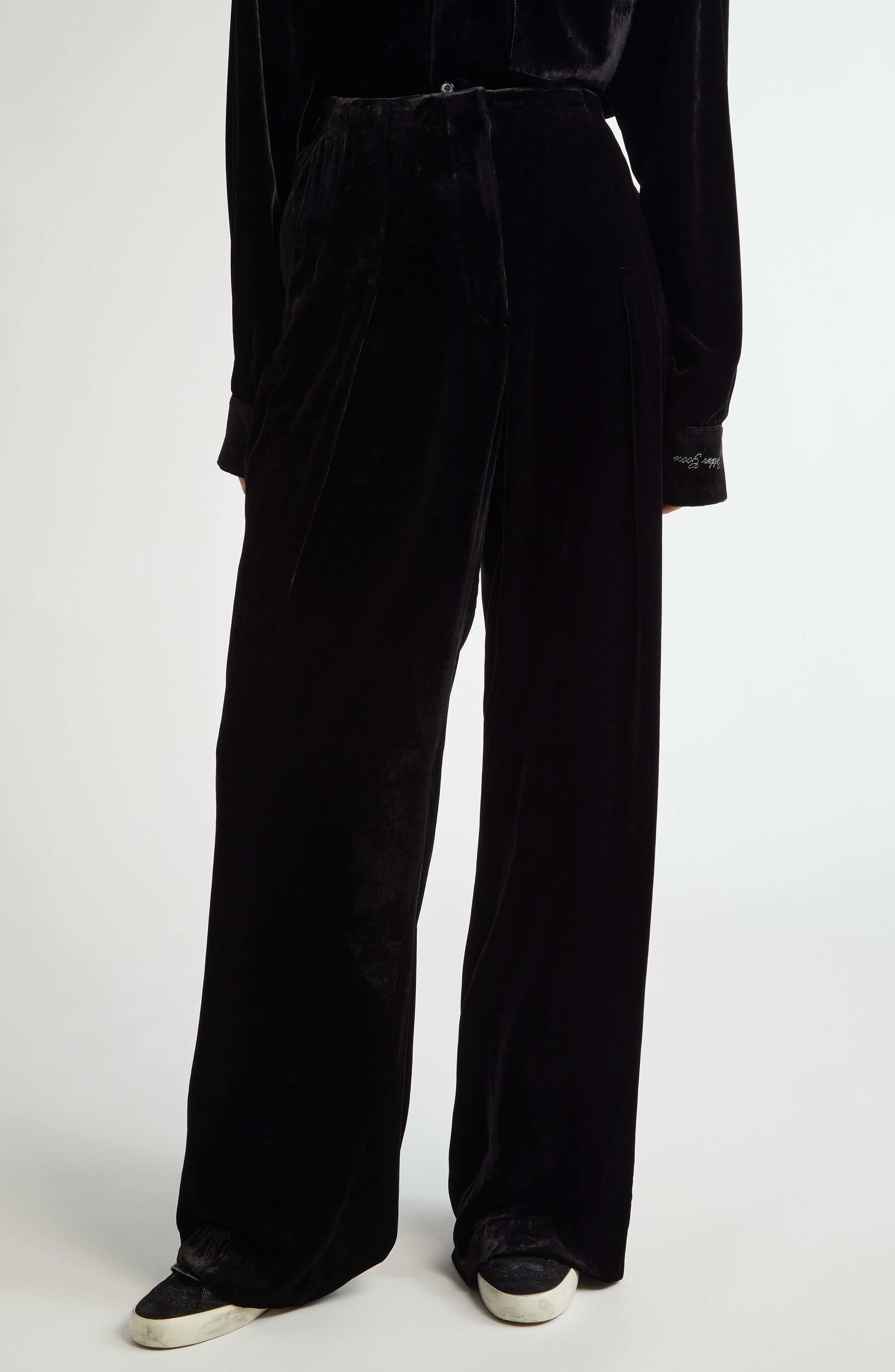 Part of the latest Journey collection inspired by the electric energy of the '90s, these pleated wide-leg pants are cut from silk-enriched velvet and finished with elastic at the back. Zip fly with hook-and-bar closure; back elastic waist Front slant pockets; back welt pocket 82% viscose, 18% silk Dry clean Made in Italy Designer Clothing