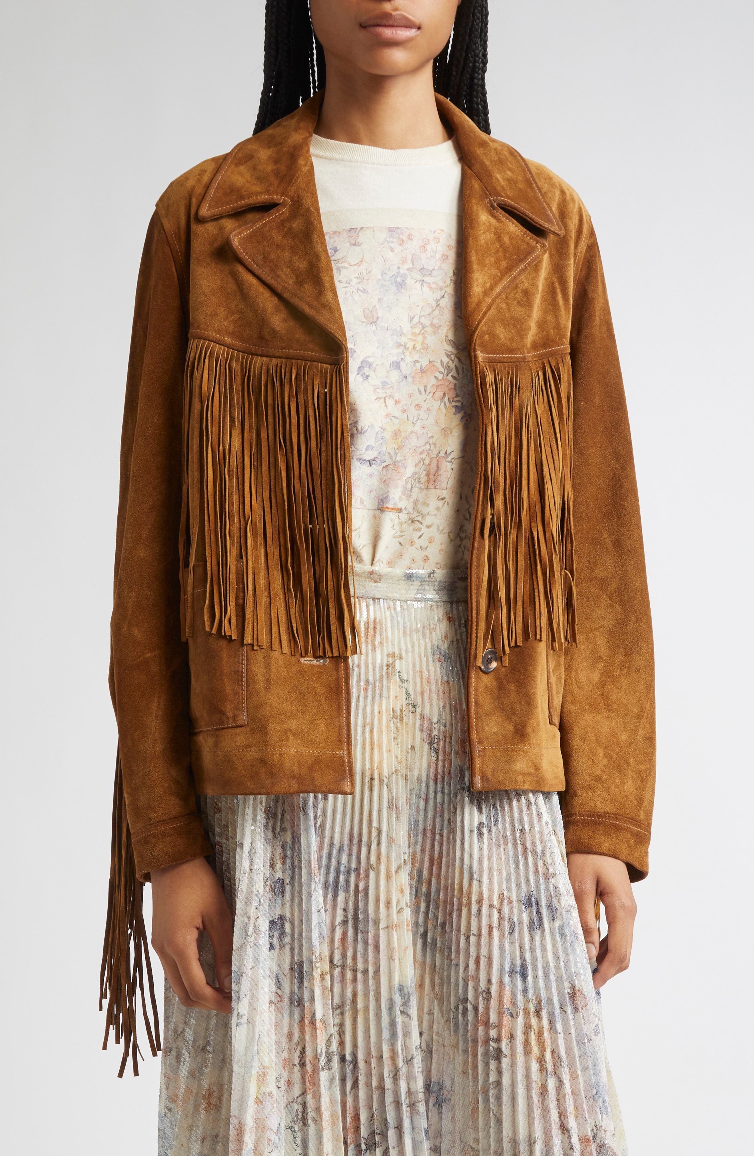 For fall '25, Golden Goose distills the carefree spirit of the '70s into nostalgic separates like this velvety Italian-suede jacket that calls forth your inner flower child with dramatic fringe cascading across the front, back and sleeves. Front button closure Notched lapels Front patch pockets Leather Professional leather clean Made in Italy Designer Clothing