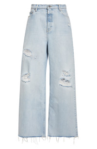 The label's signature distressing pervades a pair of wide-leg jeans cut from nonstretch denim in a cloud-blue hue. Raw hems and partial-star hardware complete the look. Zip fly with button closure Five-pocket style 100% cotton Machine wash, dry flat Made in Italy Designer Clothing
