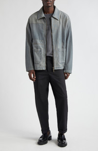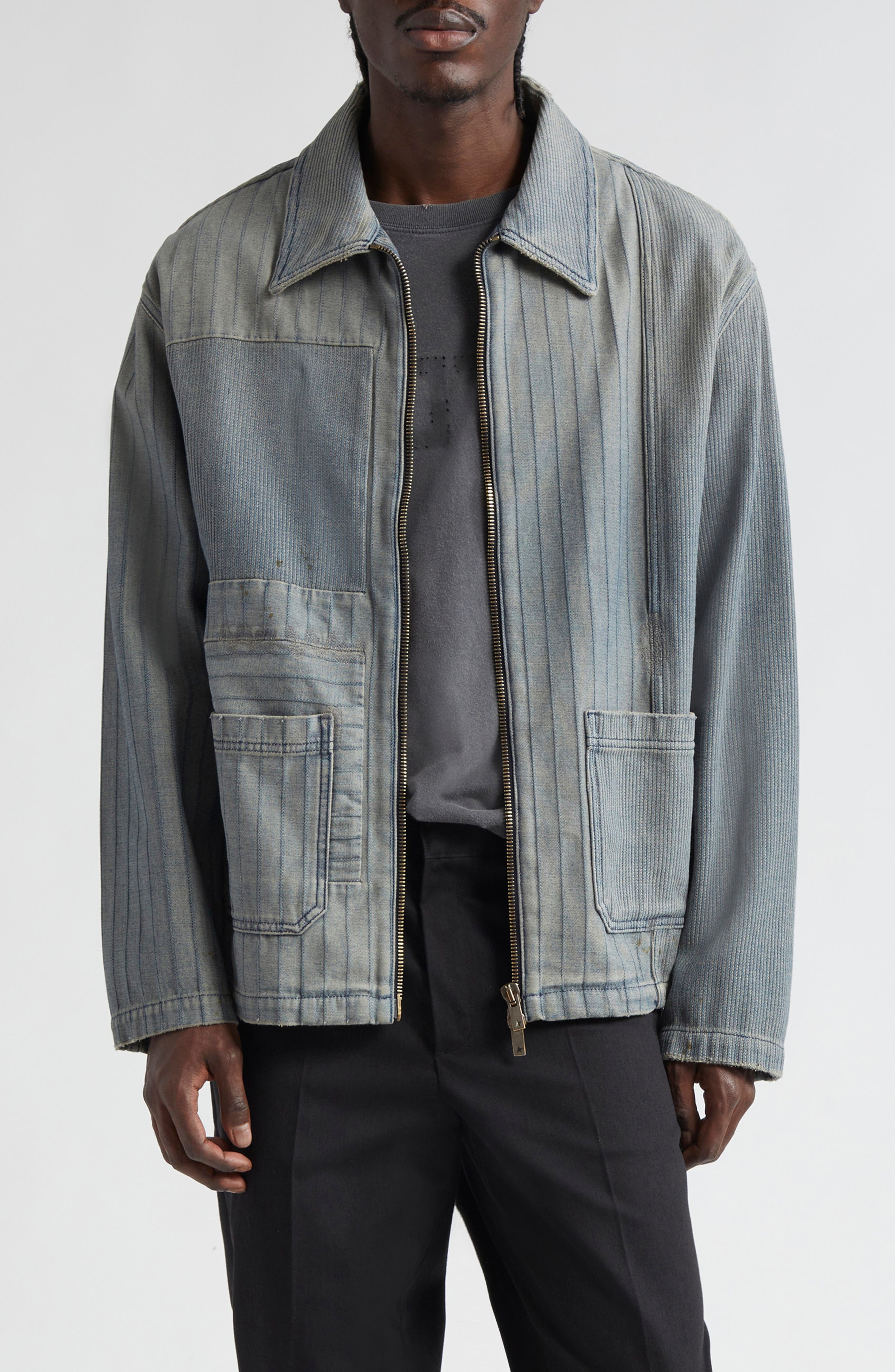 Italian denim brings signature lived-in charm to this stripey patchwork jacket outfitted with handy front pockets. Two-way front-zip closure Spread collar Front patch pockets 100% cotton Machine wash, dry flat Made in Italy Designer Clothing