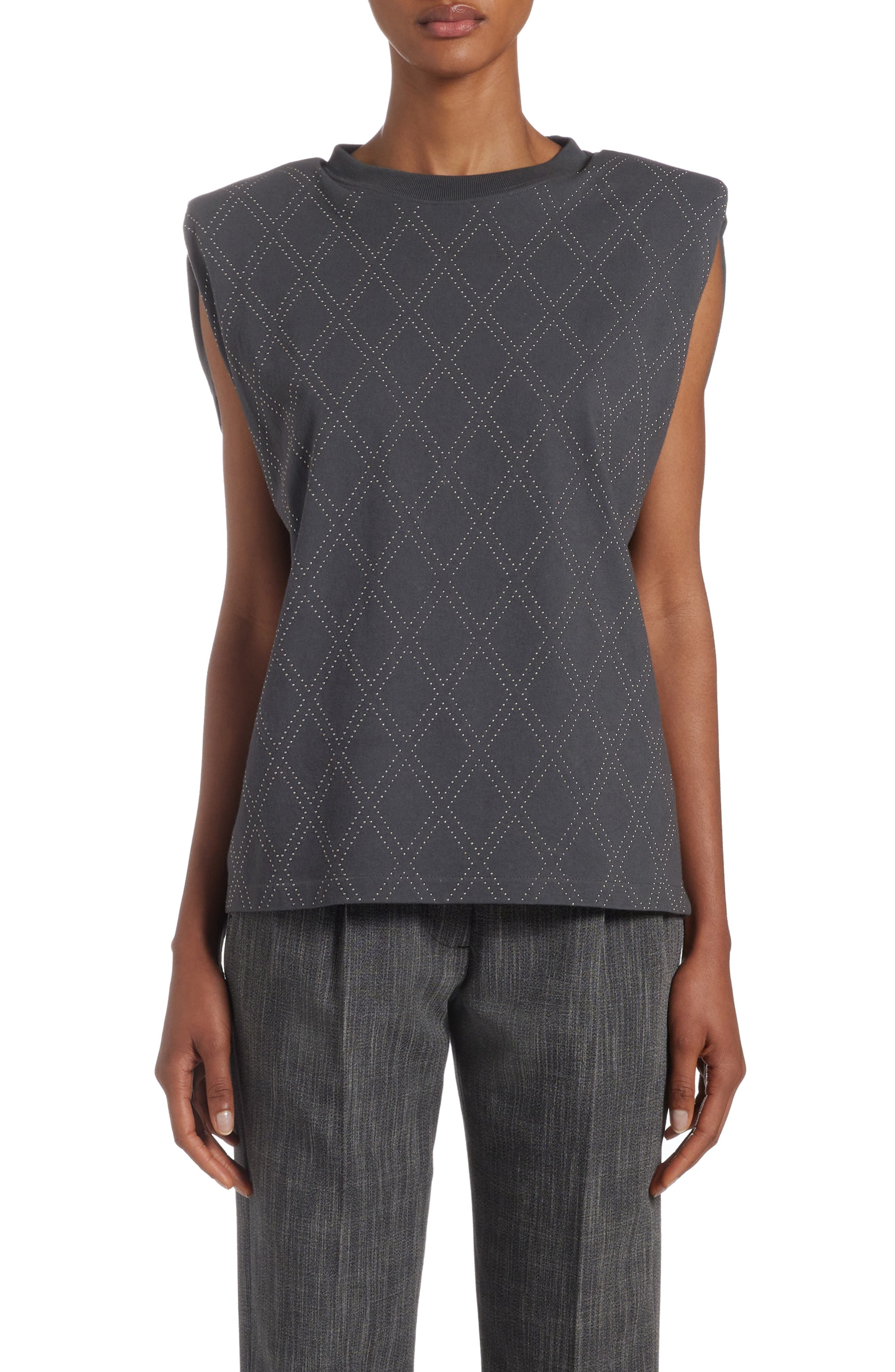Inspired by everyday glamour in the City of Lights, silvertone studs grid this soft, breathable cotton-jersey tank fitted with padded shoulders for added drama. Crewneck Padded shoulders 100% cotton Machine wash, line dry Made in Italy Designer Clothing