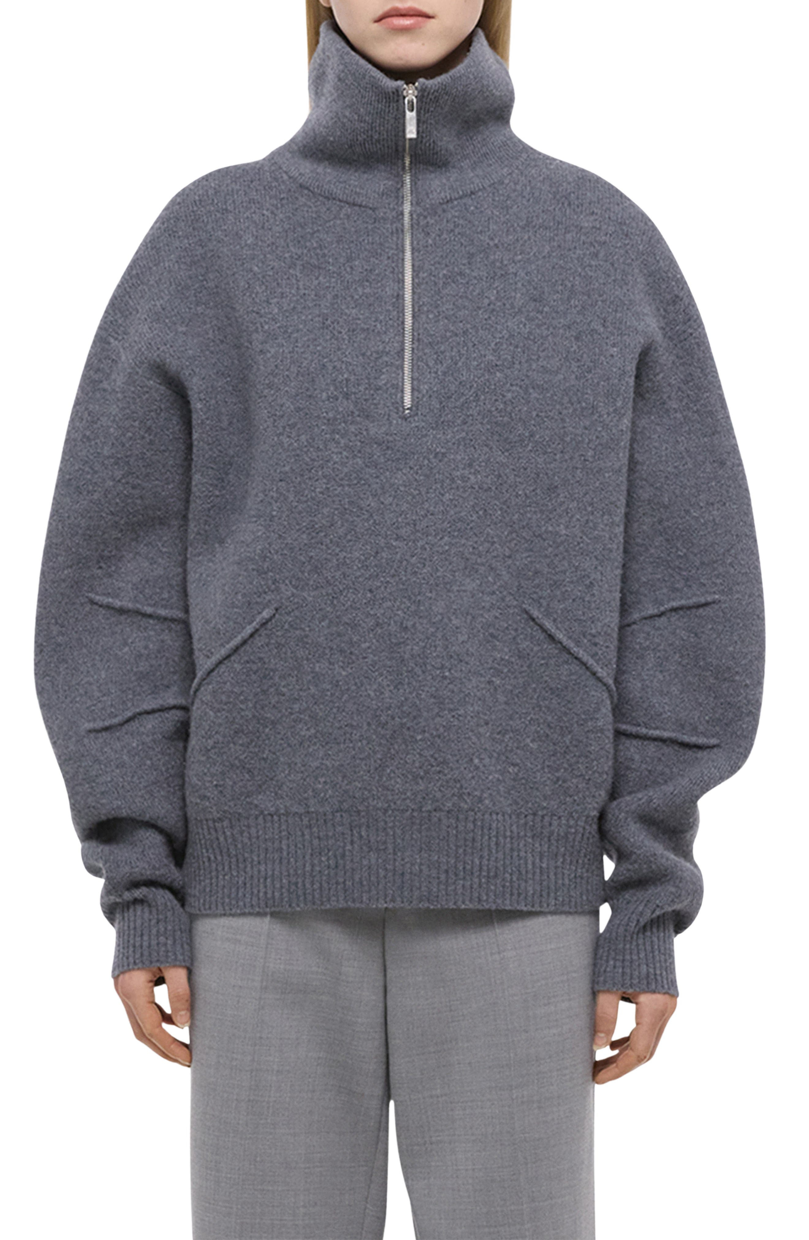 Pin-tucked seams wrap around the body of this boiled-wool sweater creating a softly curved fit topped by a fluid funnel neck. Quarter-zip closure Funnel neck Long sleeves with ribbed cuffs 100% merino wool Dry clean Imported