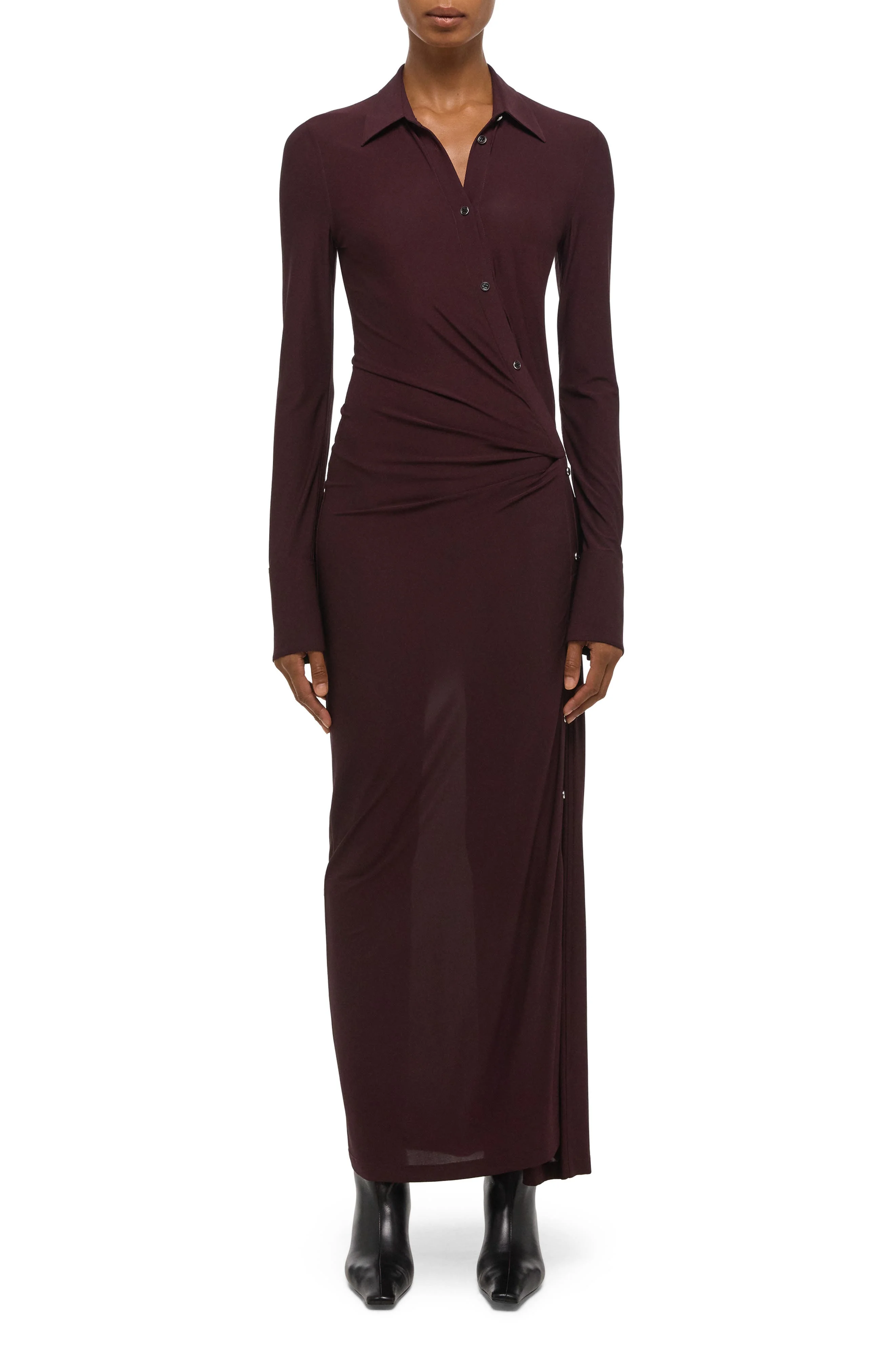 Asymmetric ruching enhances the modern allure of a curve-skimming dress complete with a dramatic side slit. Front snap closure Spread collar Long sleeves Side slit Unlined 95% viscose, 5% elastane Dry clean Imported