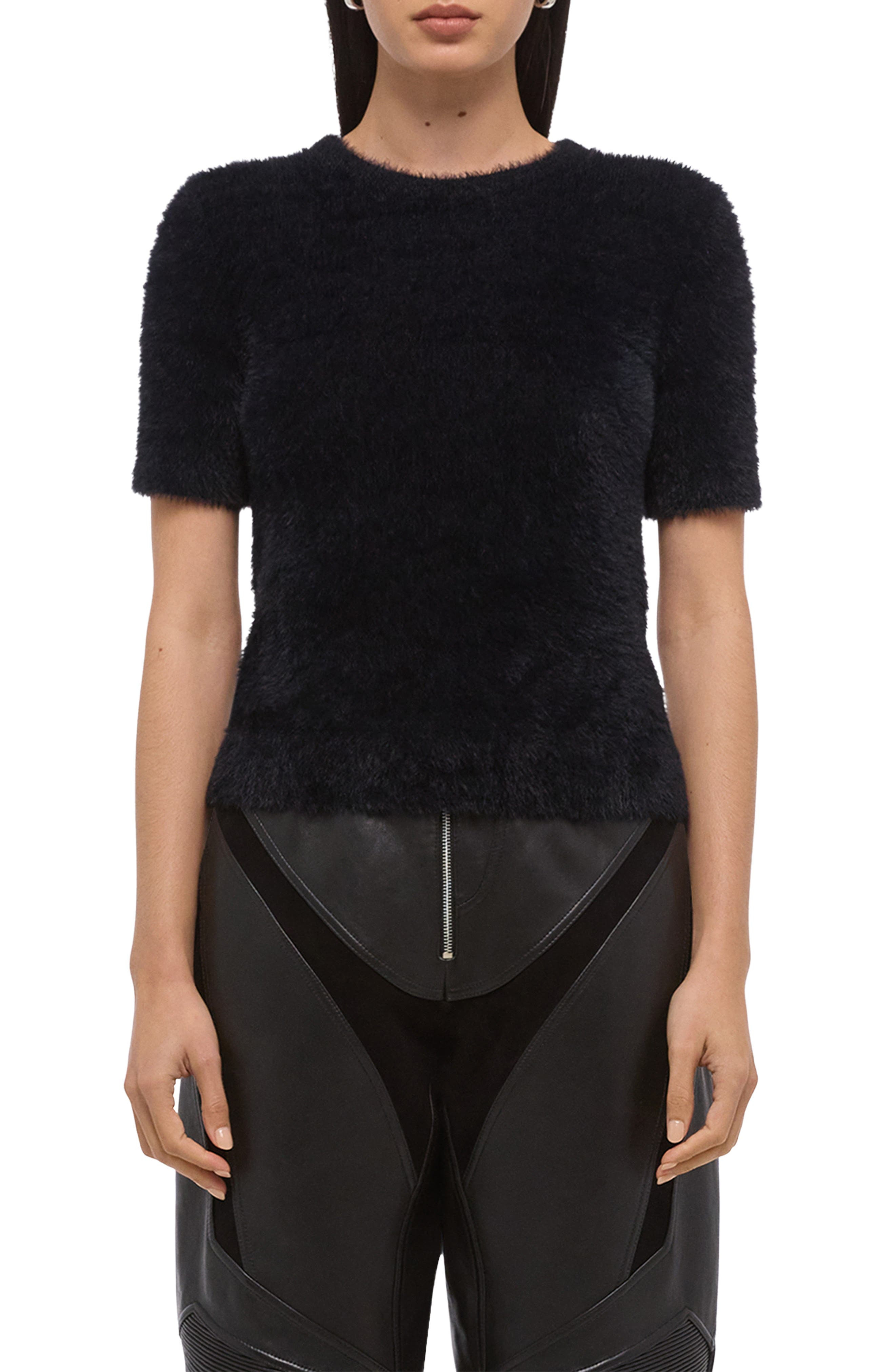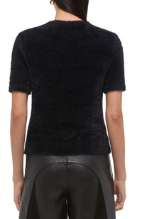 An irresistible furry texture adds warmth to this close-fitting top made in a contemporary cropped fit. 20 1/2" length Jewel neck Short sleeves 100% nylon Dry clean Imported