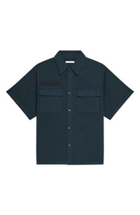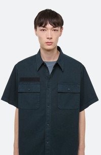 Cut from durable cotton stretch twill, this boxy short-sleeve button-up reinvents timeless design with military-inspired touches like a grosgrain chest detail and roomy patch pockets. 29 1/2" length Front button closure Point collar Short sleeves Chest button-flap patch pockets 96% cotton, 4% elastane Machine wash, dry flat Imported