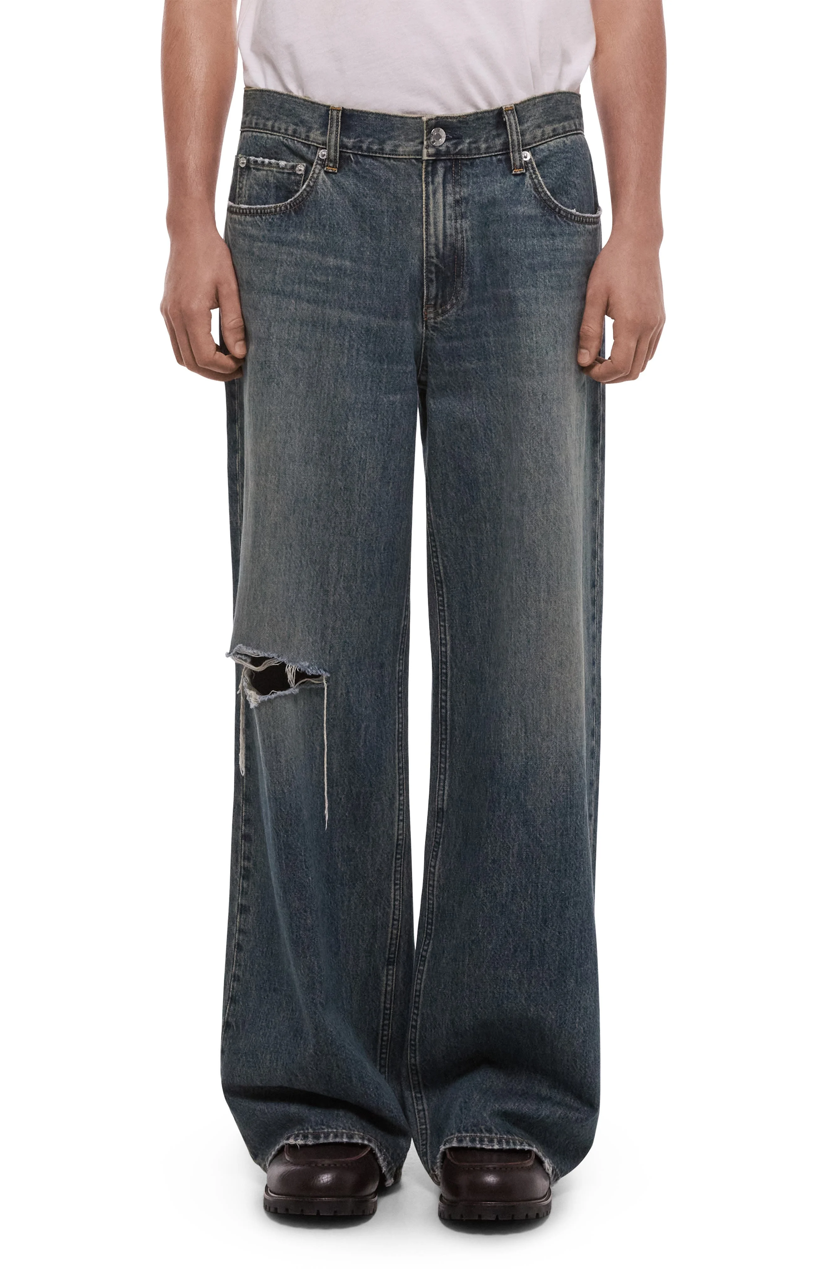 A slashed knee authenticates a pair of nonstretch jeans cut in a roomy fit and turned to a well-loved fade. 32" inseam; 24" leg opening; 12 1/4" front rise Zip fly with button closure Five-pocket style Machine wash, line dry Imported
