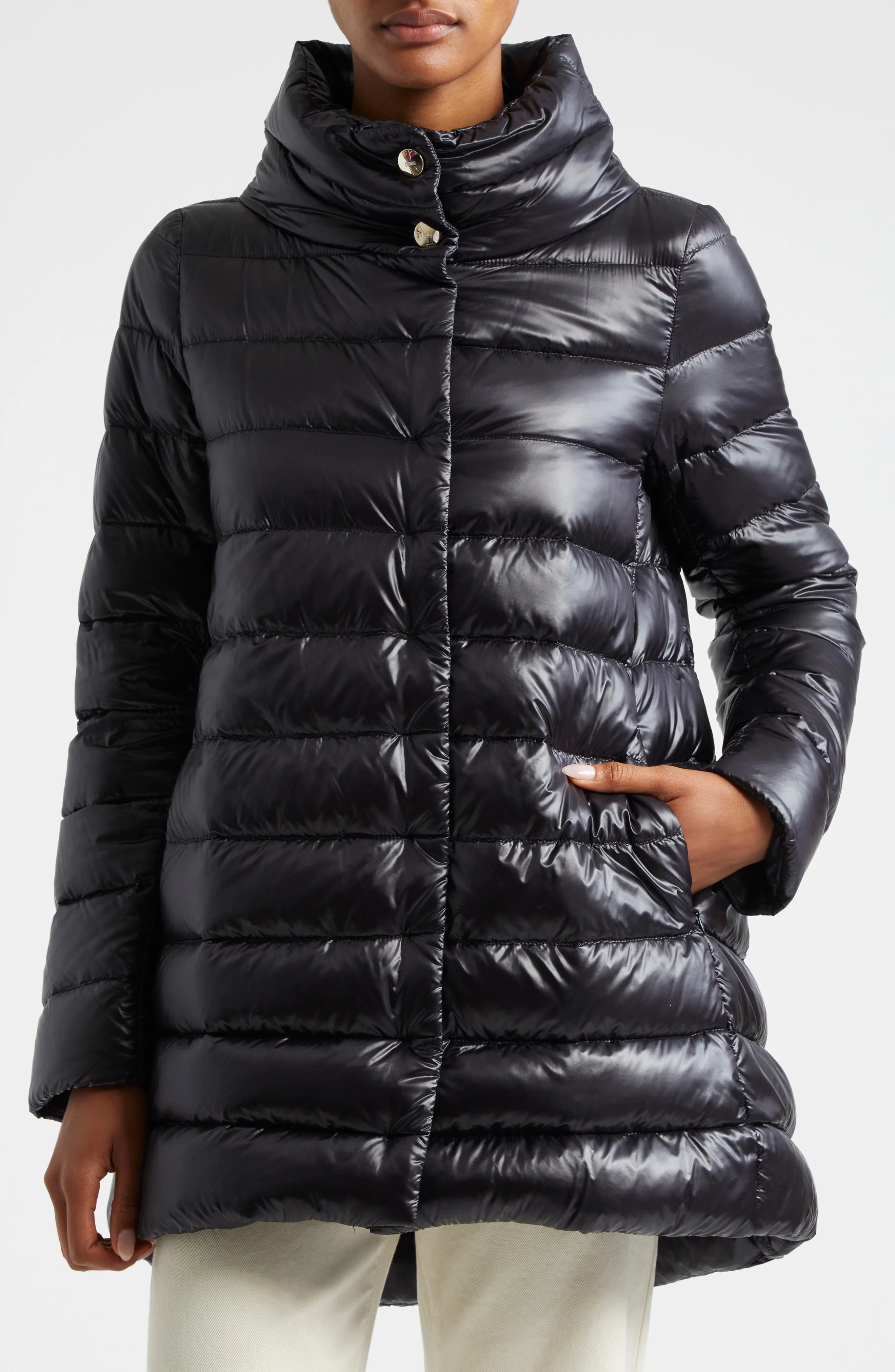 A high funnel neck and extended back hem create a cozy cocoon of warmth in this understated A-line jacket insulated with medium-weight down fill. 30" front length; 33" back length (size 42 IT) Hidden-snap placket Funnel neck Hidden side-zip pockets 200 g/m² Ultralight nylon shell Water resistant Lined, with 90% down, 10% feather fill 100% polyamide Hand wash, dry flat Made in Romania Designer Clothing