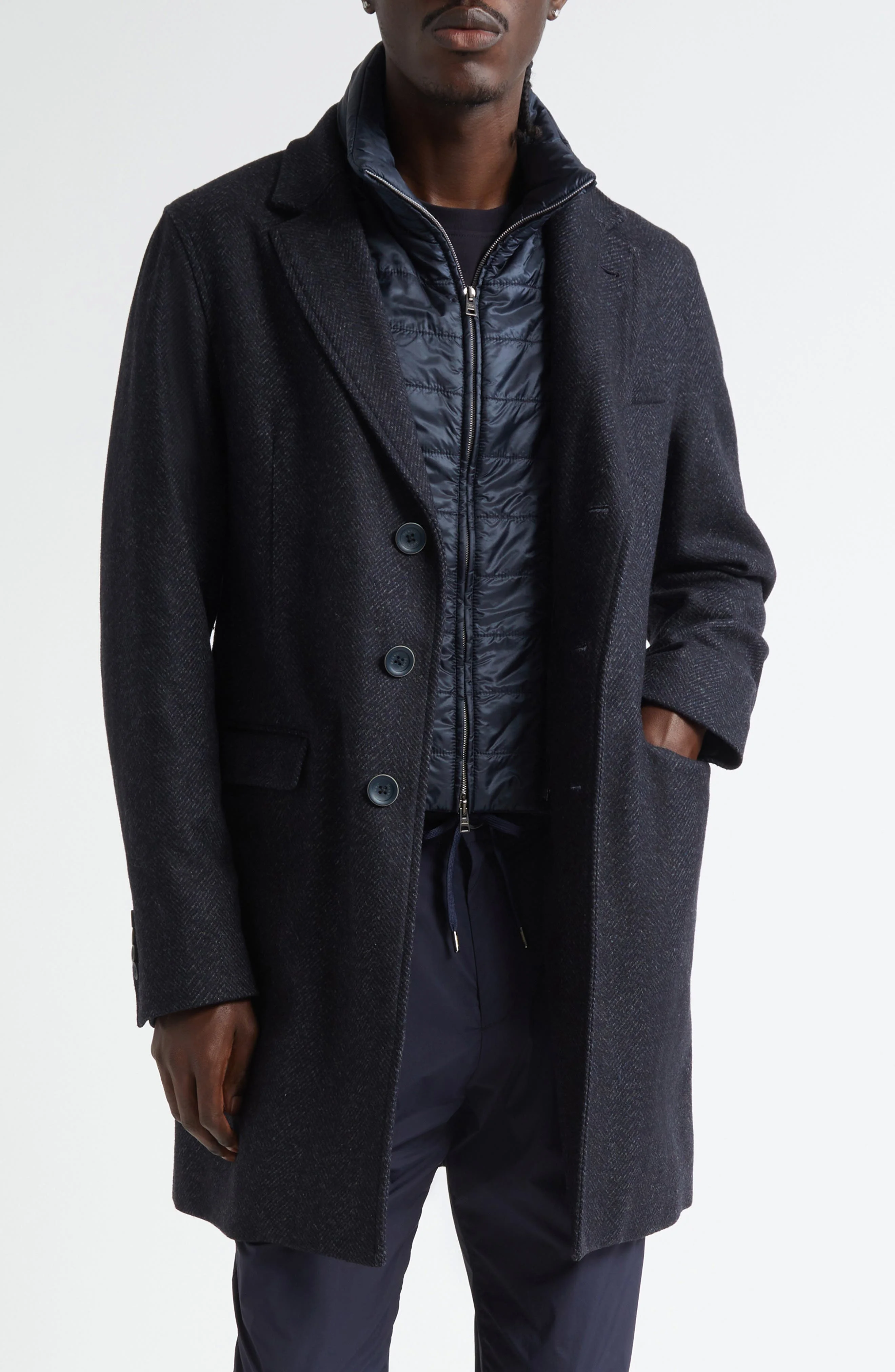 Herno Wool Blend Herringbone Topcoat with Removable Insulated Bib in Blue Navy at Nordstrom