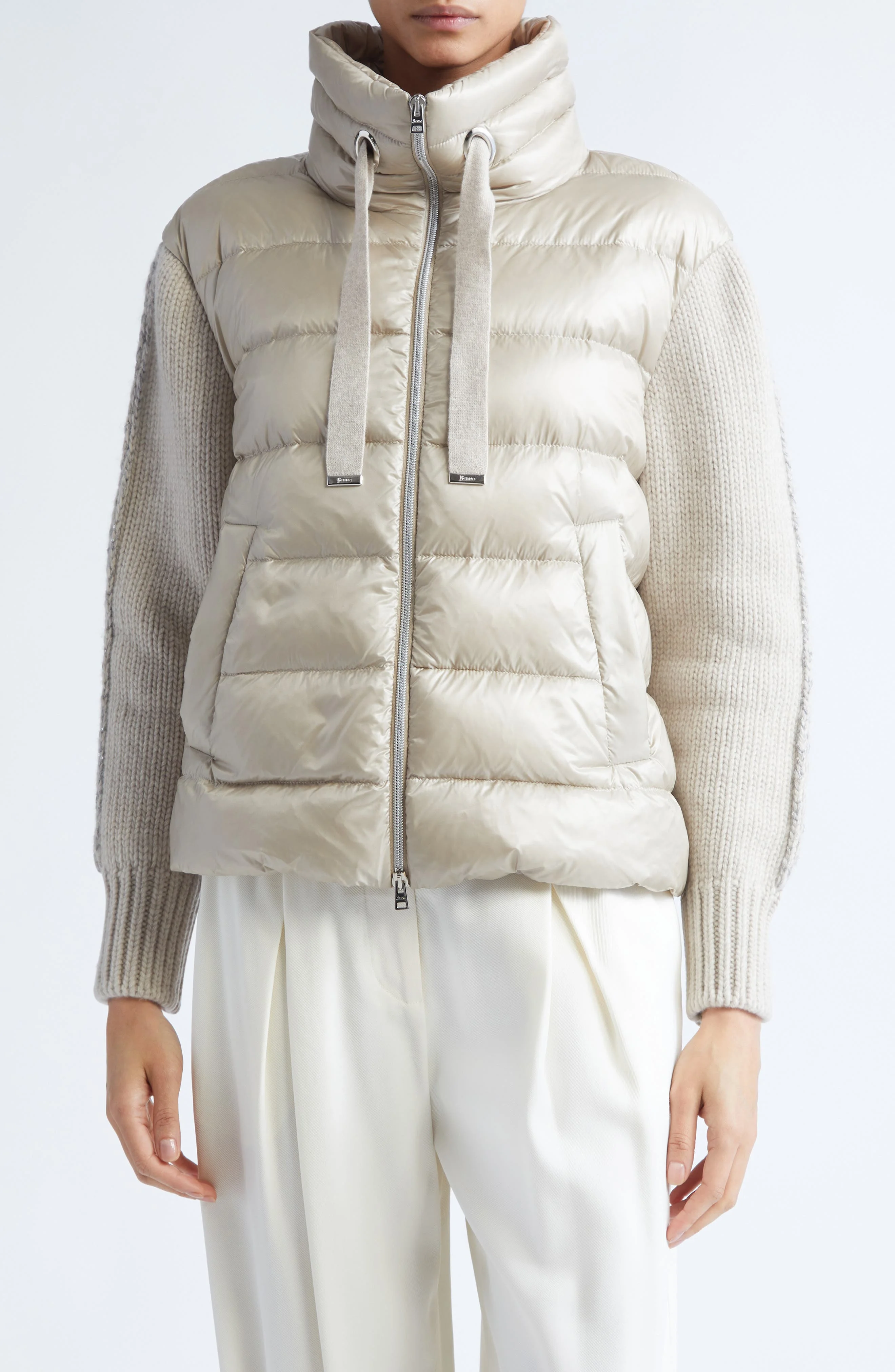 Herno Wool Knit & Ultralight Nylon Puffer Jacket in Champagne at Nordstrom