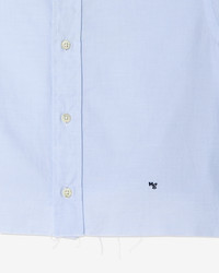 Men’s button up shirt in chambray blue. Embroidered with our signature ‘Hg’ monogram. Cropped with raw edge. Mashine Wash Warm