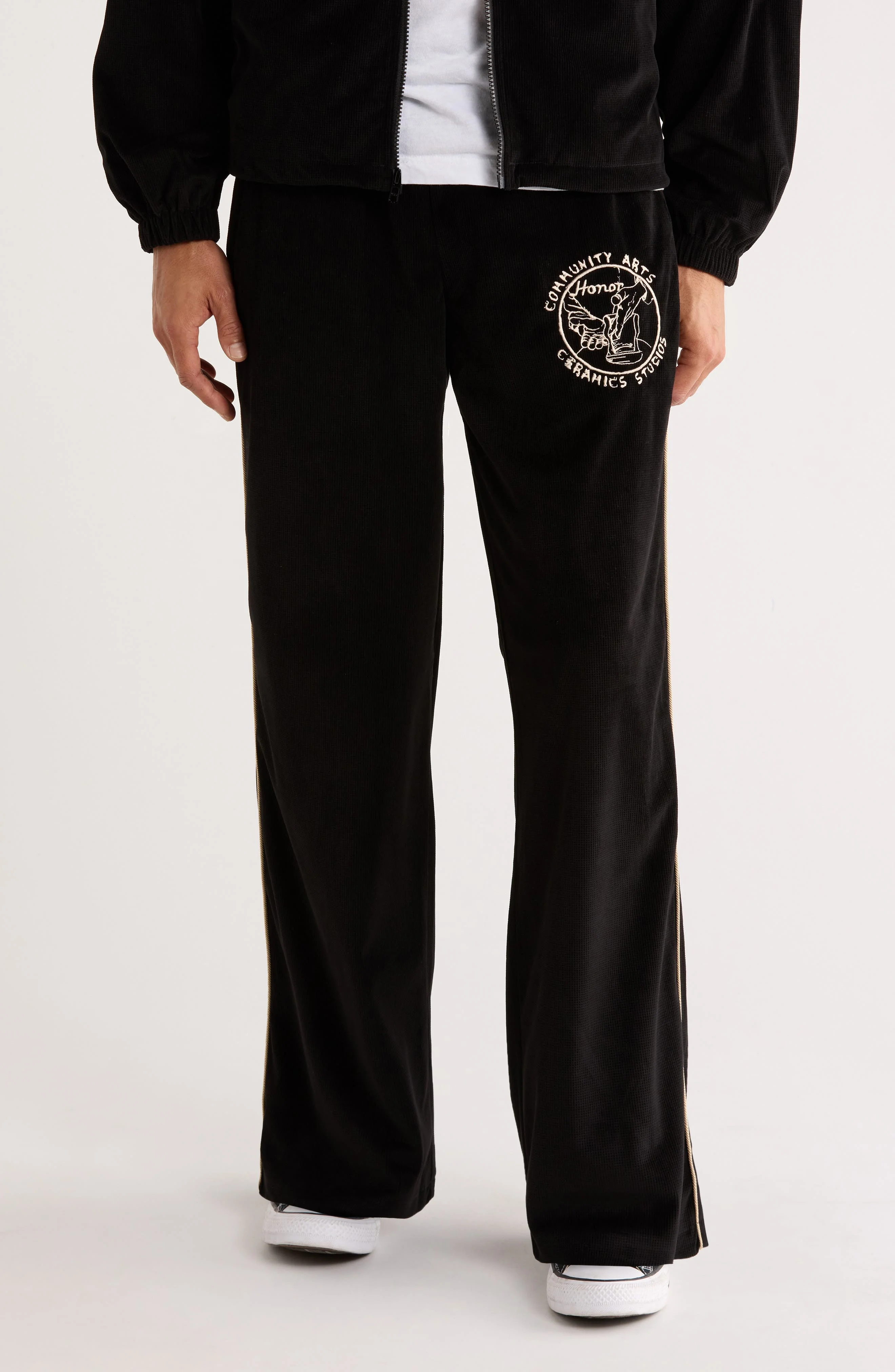 Side piping adds a pop of contrast to these supersoft track pants embroidered with the label's ceramic arts logo. Elastic waist Side-seam pockets; back patch pockets 100% polyester Machine wash, tumble dry Imported Black Owned/Founded