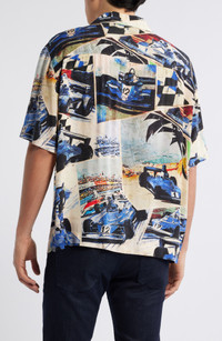An explosion of race-car images revs up the energy of a camp shirt made for riding or relaxing in the comfort of soft, lightweight viscose. Front button closure Notched collar Short sleeves 100% viscose Machine wash, line dry Imported