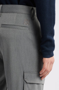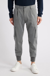 Crisp knife pleats add smart looks plus a bit of extra room to joggers that are cut from soft, stretch-enhanced twill and fitted with plenty of pockets for holding a day's essentials. 27 1/2" inseam; 5" leg opening; 12 1/2" front rise; 15" back rise Zip fly with button closure Front slant pockets; back welt pockets; cargo flap-patch pockets Ribbed cuffs 68% polyester, 28% viscose, 4% elastane Machine wash, line dry Imported
