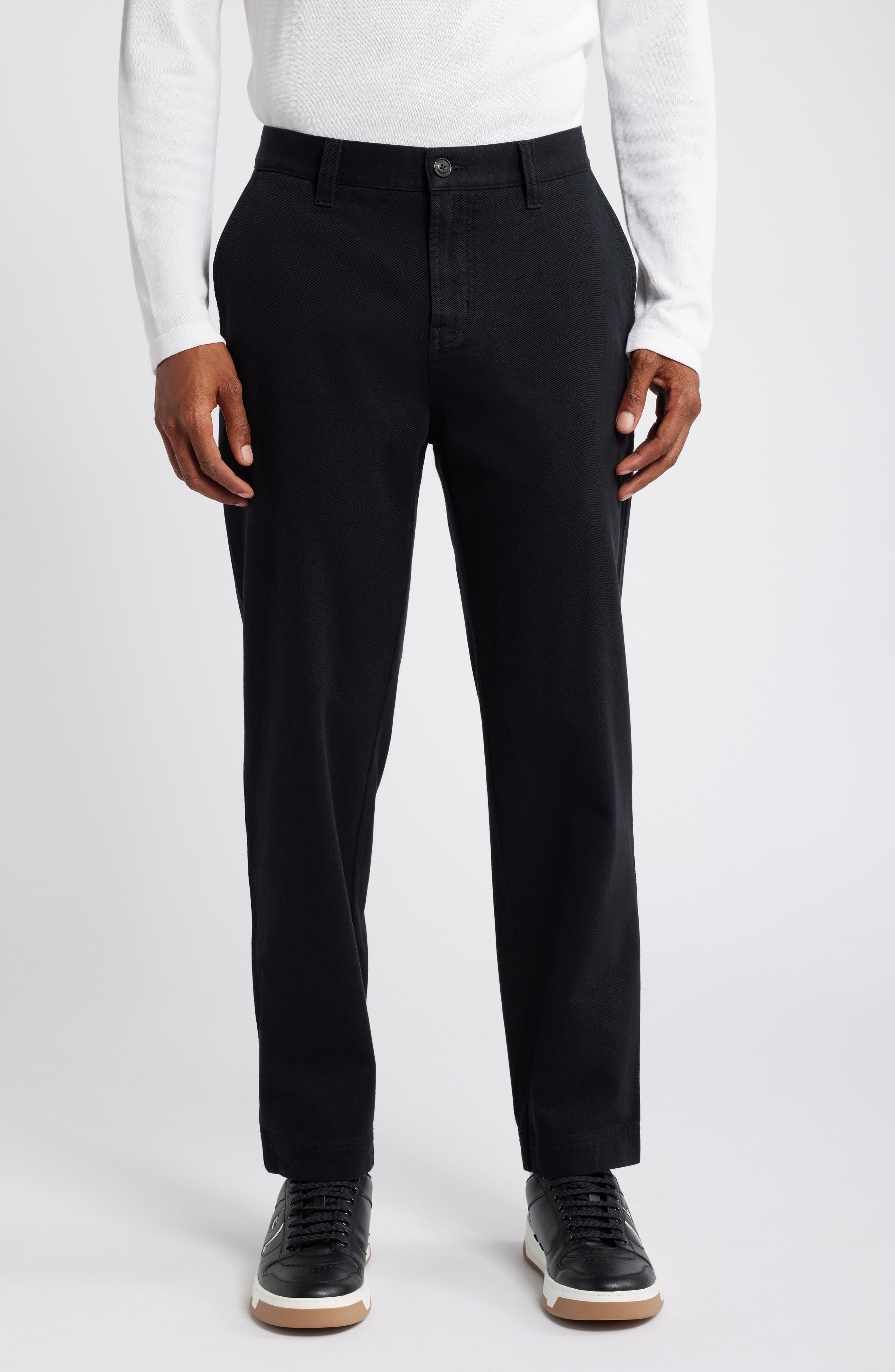 Soft cotton twill brings breathable comfort to chinos that are styled with a classic flat front and a slight taper in the legs for a versatile, everyday look. 28 1/2" length; 7" leg opening Zip fly with button closure Front slant pockets; back welt pockets Unhemmed 100% cotton Machine wash, line dry Imported