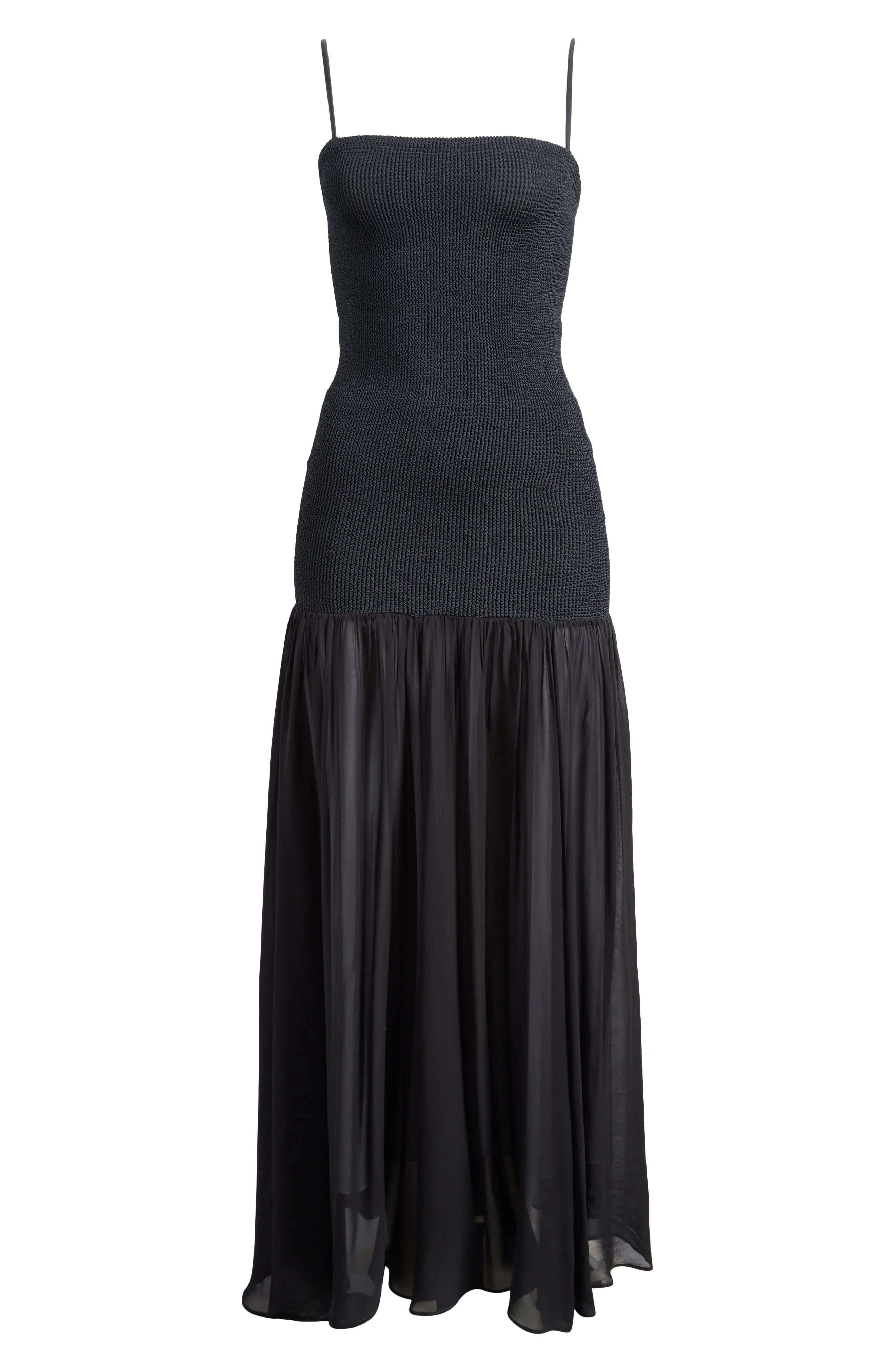 Designed to take you from beach to dinner, this elegant style blurs the line between cover-up and dress with its study in contrasts. Elegance and easy, the dropped-waist bodice is made from the label's signature Original Crinkle fabric—that stretches to flex, sculpt and support every curve for an adaptive one-size-fit—while the maxi skirt flows in a sheer, fluid curtain of breathable mesh. The one-size design offers a custom-like fit for US 2-14 Slips on over head Square neck Sleeveless 97% polyamide, 3% elastane Machine wash, line dry Made in Morocco