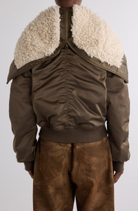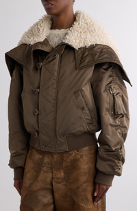 Shimmer and shine as you stay warm in this quilted satin coat designed with a cropped, ball-shaped cut and finished with plush faux shearling along the lapels. Front zip closure with button storm placket Fixed hood Ribbed cuffs and back hem Front snap-welt pockets Button-tab hem Lined 100% polyamide with 100% polyester faux-shearling trim Dry clean Imported