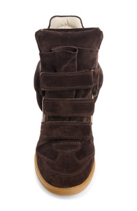 A hidden wedge ramps up the retro vibe of this high-top sneaker crafted from soft suede in a rich chocolate hue. A trio of hook-and-loop straps and a softly padded collar complete this signature style. Adjustable hook-and-loop straps Leather upper and lining/rubber sole Made in Portugal Designer Shoes