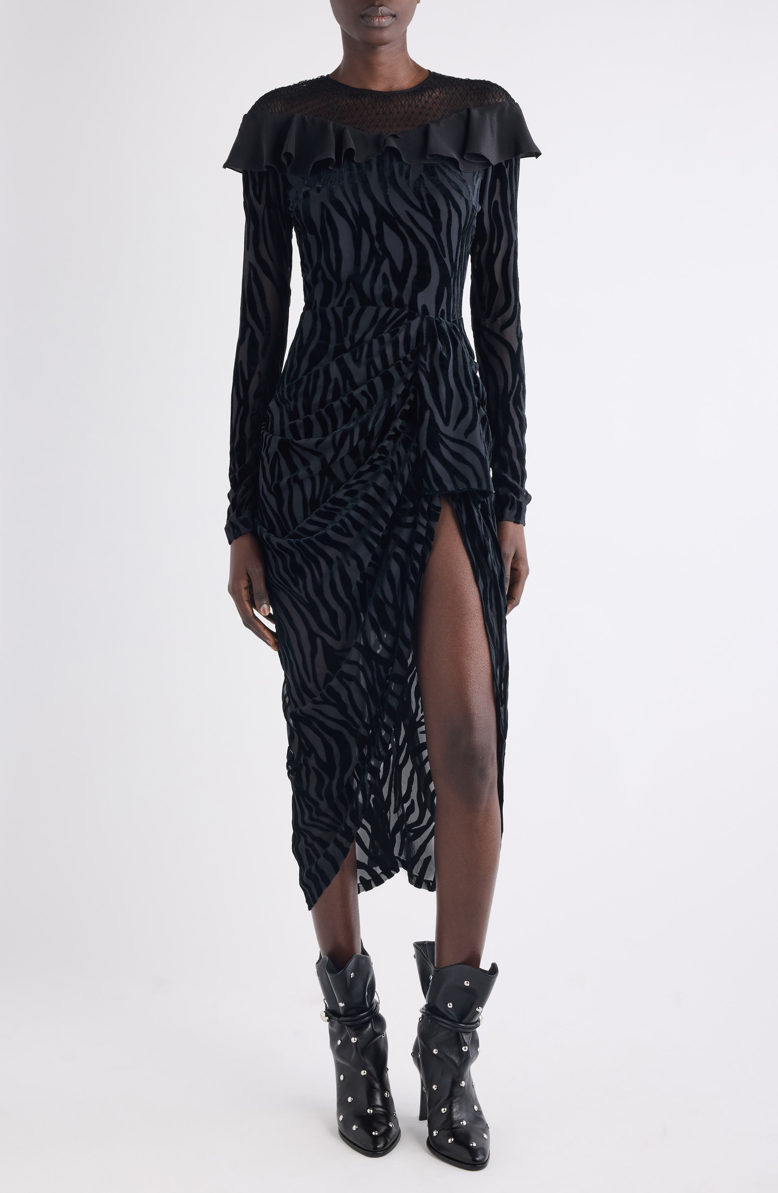 A soaring front slit brings a leggy look to this runway-featured dress cut from zebra-stripe burnout fabric and topped with a ruffle-framed lace yoke. Hidden back-zip closure Crewneck Long sleeves Front slit Unlined 64% viscose, 36% silk Dry clean Made in Portugal Designer Clothing