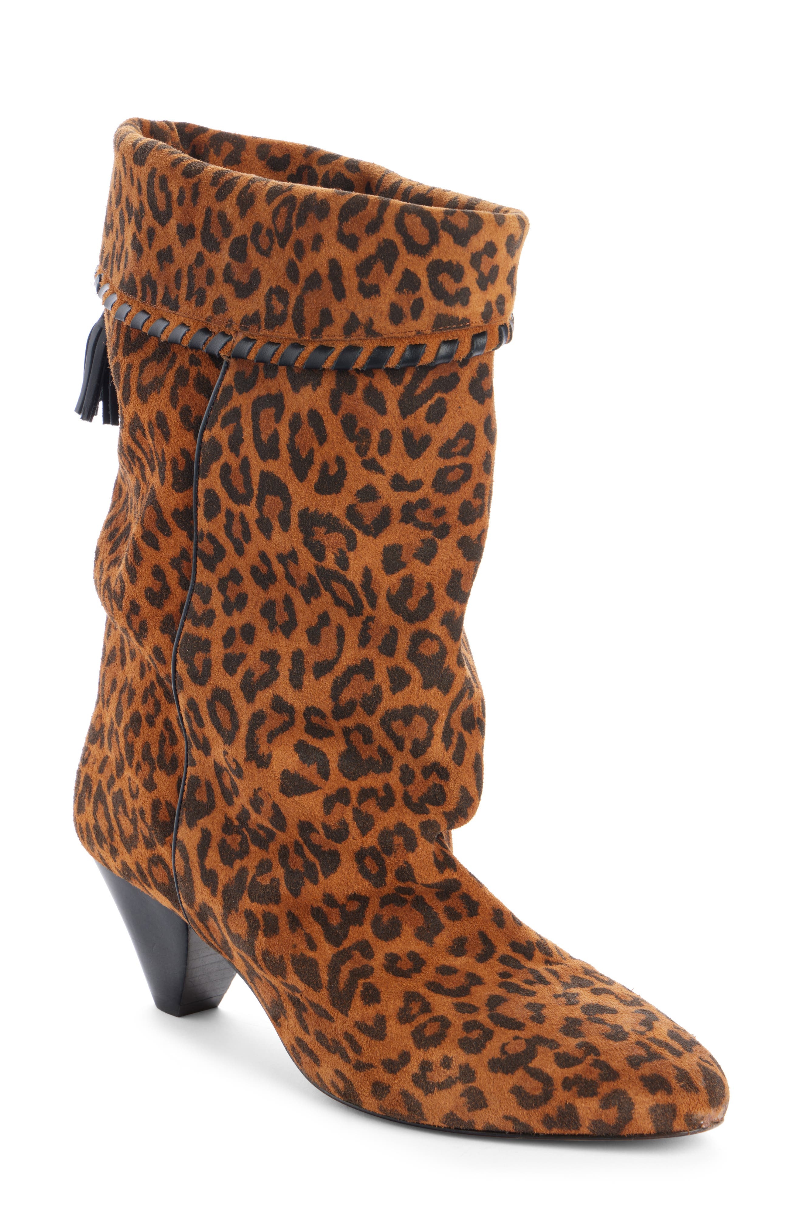 The designer's signature cone heel enhances the distinctive look of this leopard-print suede boot made in a slouchy silhouette completed with a whipstitch-detailed cuff. Pull-on style Leather upper, lining and sole Made in Portugal Designer Shoes