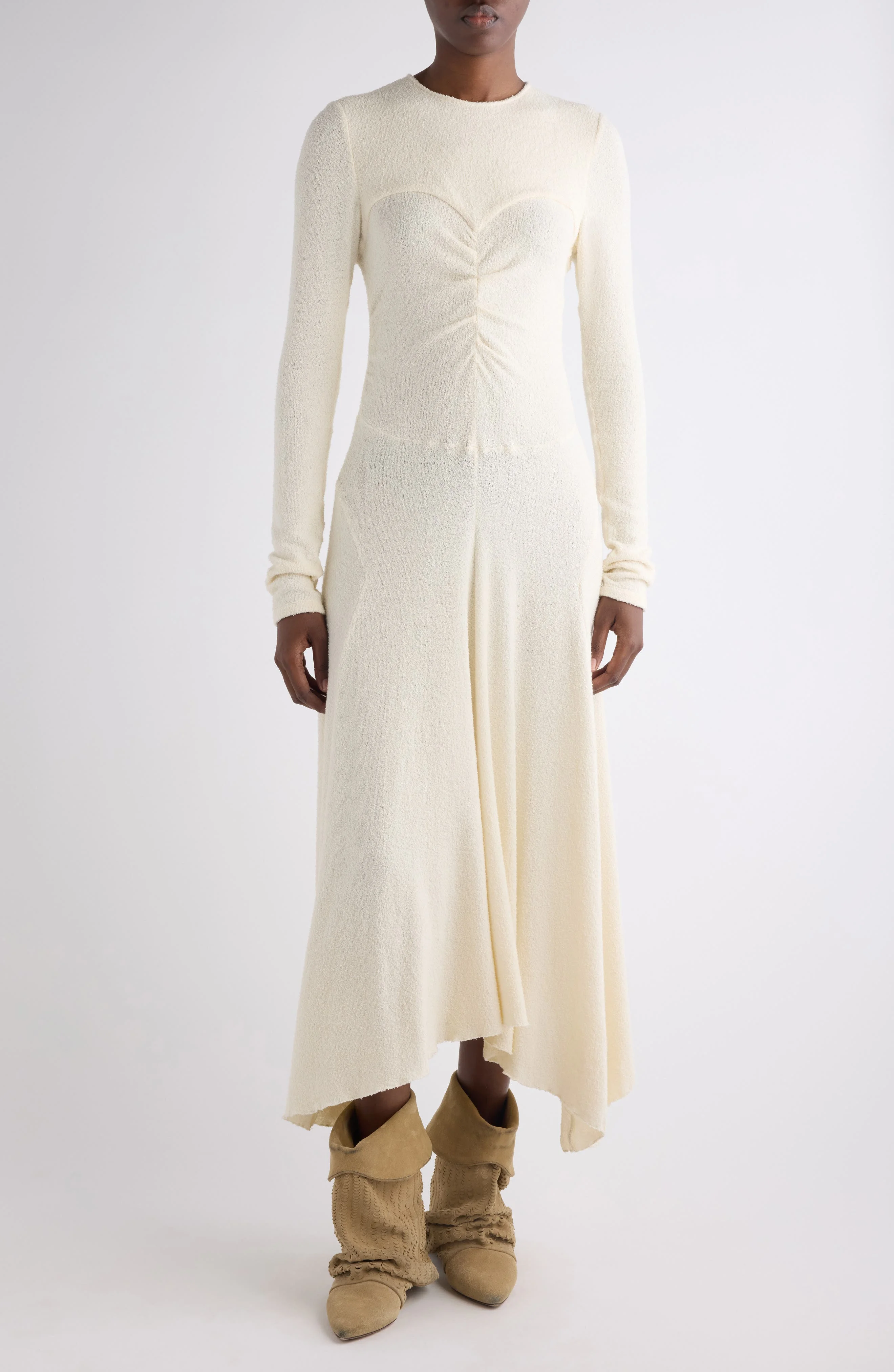 Flora Ruched Boucle Long-Sleeve Midi Dress