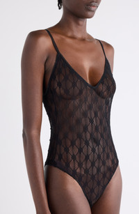 The Parisian house distills bohemian romance into gossamer floral lace that reads like filigree on the skin. This curve-skimming bodysuit draws a clean V with slender straps and leaves a soft shadowplay wherever it goes. Snap closure Deep V-neck Spaghetti straps Sheer 85% polyamide, 15% elastane Dry clean Made in Portugal Designer Clothing